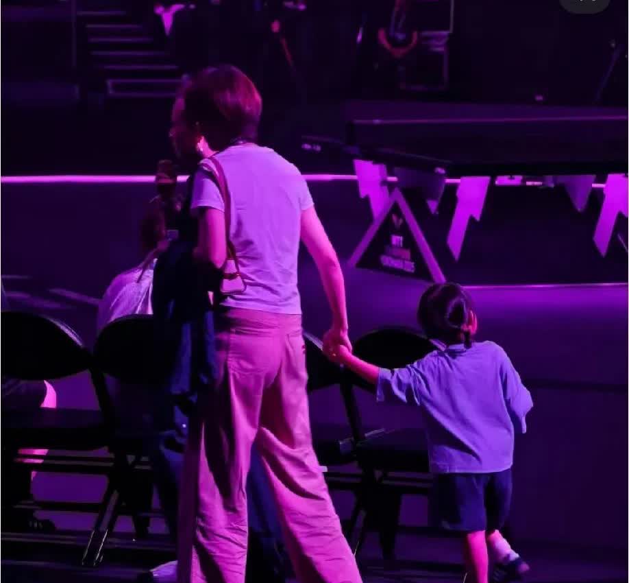 许昕的乒乓球俱乐部组织了一帮小朋友参加夏令营,姚彦带着小女儿坐前排看比赛。 马