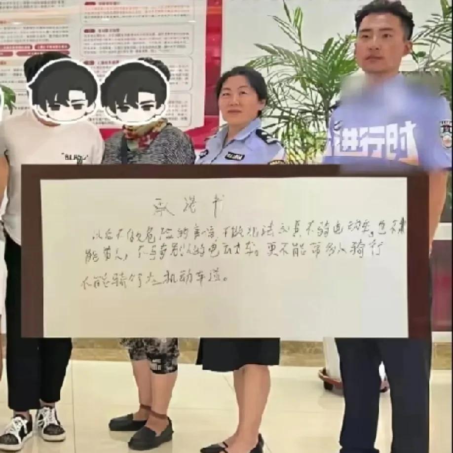 近日,内蒙古街头4个未成年人,1人在前面骑共享单车,共享单车后座放了一个大的长躺椅,长躺椅上坐了3人,就这样穿行在大街上,被交警逮了个正着。交警就很纳闷的问:“后边你们3人是如何保持平衡的?”其中一名男孩说:“体重大的坐中间,轻者坐两边。” 交警针对4名未成年人这种危险的骑车行为,分别约谈了4人的家长,并让这4个男孩写下承诺书,承诺以后不会再有这种行为。 这4个孩子牛呀!成功攻克了一辆共享单车上如何可以坐4个人的难题,物理中的力学应该学的不错,[捂脸]可一看这承诺书上写的字就知道这4人聪明的脑子没用在学习上,太不让家长省心了!是该好好管教管教,多危险的行为,这是无知者无畏呀!