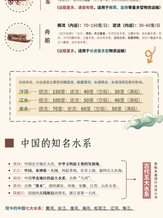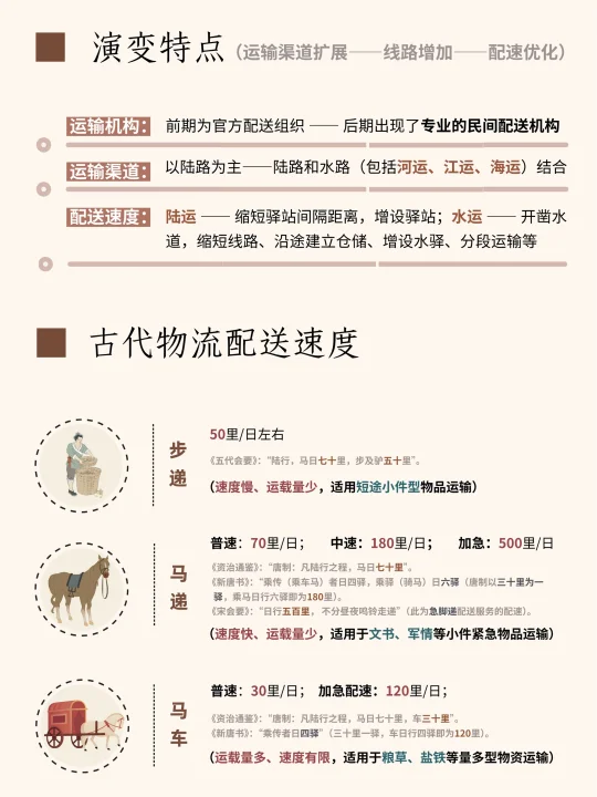古代前期以官方运输网络为主,成熟的异地运输系统可以有效满足公文军情信息的传输及战略物资、宫廷生活物资、官员俸禄等资料的供给,邮驿(陆运)、漕运(水运)的运输模式便是在这样的需求下产生的。 官运机构是不承接民间代运服务的,而早期高度农耕化及相对分散的民居形态,又非常地消耗配送成本,民间物流机构很难规模化,像民信局、镖局这类民间运货组织,基本要到明朝也逐渐发展成熟。 一方面是随着商品经济的发展,民间对异地商品的需求指数有所增长,二是城市化进程会将人们的居住场地集中化,形成高密度的活动空间,可减少运输和配送的成本,专业的民间配送机构也就应运而生了。 官方运输中可调配的资源多,速度自然有所保证,骑马送货是所有运输方式中最快的一种,如果有加急需求的话,日行500里非常了不起的数据了(《宋会要》:“日行五百里,不分昼夜鸣铃走递”),至于日行千里的说法,可能就有艺术修饰的成分在了,而在无特殊运输需求下的官运配速,200里/日以内才是比较普遍的速度。