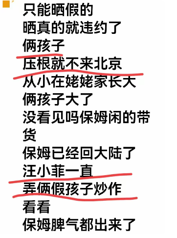 有人说,汪小菲带回来的孩子是假的, 真的小玥儿和箖箖在外婆家。 俩孩子压根不来北京, 只认从小带他们的外婆。 我就想说, 这脑洞到底有多大啊? 能想出这剧情来! 人才啊! 真是人才啊! 这么匪夷所思的剧情,你都能想出来。 这位网友,你不当编剧真是太可惜了!