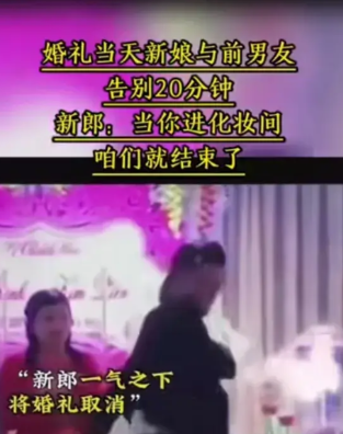 婚礼当天,新娘的前男友来找她,新郎要求新娘不要和他见面了。新娘认为前男友和自己谈了五年,应该好好的告个别。她没有遵循新郎的意见,和前男友告别了20分钟。新郎当即取消了婚礼,他对新娘只说了一句话,当你进化妆间,咱们就结束了。这个女人真是拎不清,这个时候还有什么前男友,心里只能有现任。