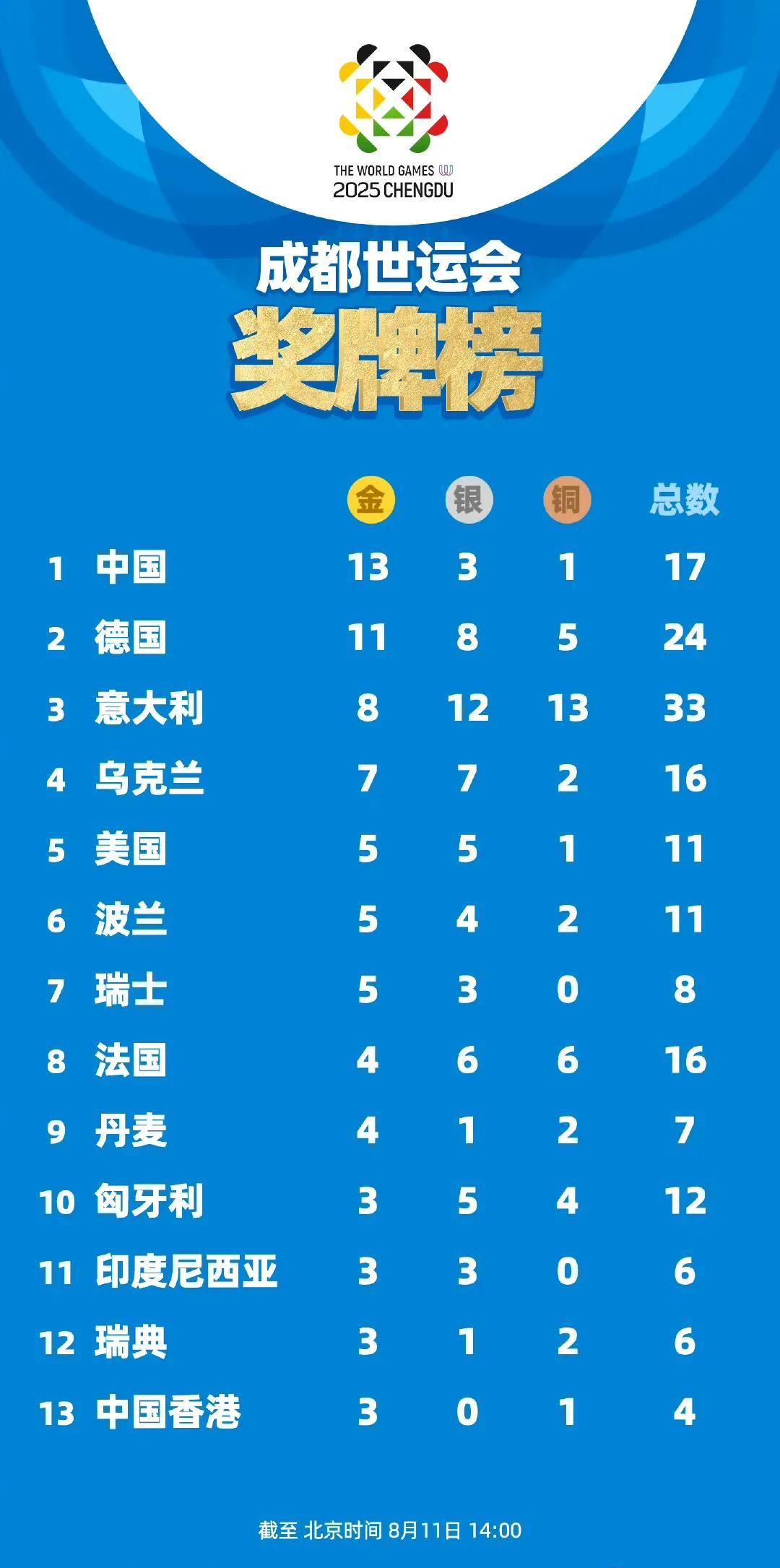 2025成都世运会奖牌榜:中国暂列榜首,德意乌美前五! 据悉,本届世运会共设34个大项,60个分项中,涵盖空手道、射箭、武术、体操、皮划艇等众多奥运会项目。 中国代表队前11届世运会上共计夺得77枚金牌,位列意大利、美国、德国、俄罗斯和法国之后,本届世运会,中国代表队的目标是冲击金牌榜榜首!