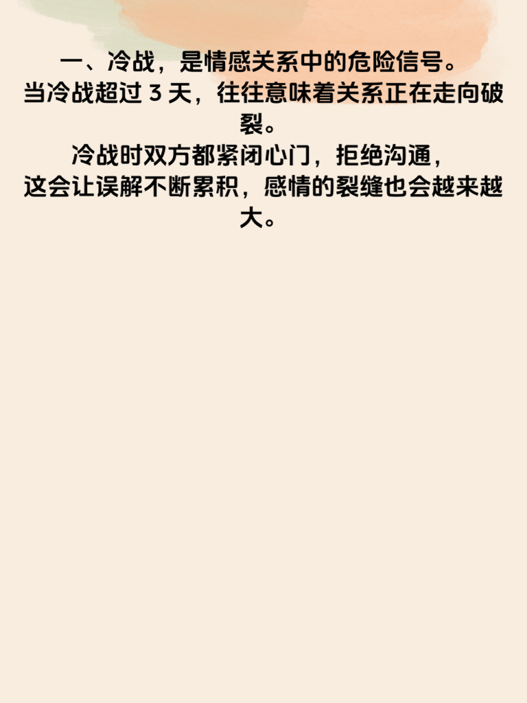 一、冷战,是情感关系中的危险信号。当冷战超过3天,往往意味着关系正在走向破裂。冷战时双方都紧闭心门,拒绝沟通,这会让误解不断累积,感情的裂缝也会越来越大。 二、为什么冷战3天就如此关键?因为最初的冷战可能只是小摩擦后的赌气,但随着时间推移,沉默滋生的冷漠会侵蚀爱意。3天后,彼此习惯了这种无声的“对抗”,心也会逐渐变冷。 三、男生们要明白,追求女生时,冷战是大忌。若发生矛盾,应及时诚恳沟通,主动打破僵局。比如送个小礼物,写封暖心的信,勇敢迈出第一步,别让冷战毁掉好不容易建立的感情。记住,感情需要呵护,主动沟通才能让爱长久。