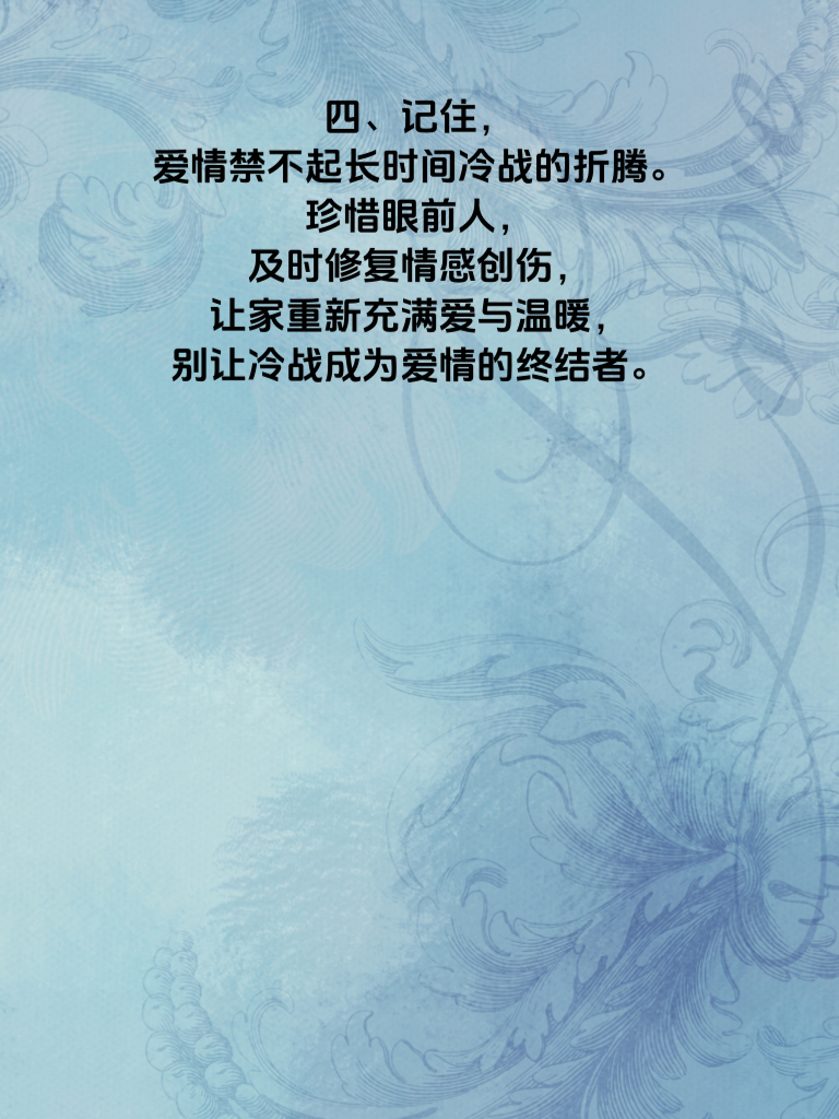 一、夫妻冷战超3天,情感的裂缝会悄然扩大。沉默像一层阴霾,笼罩着原本温馨的家。双方都在倔强中僵持,却忘了,爱情需要沟通来滋养。 二、冷战超3天,彼此的关心被冰封。曾经的甜蜜问候消失,只剩下冷漠的空气。这不仅伤害感情,还可能让误会生根发芽,让对方在孤独中渐行渐远。 三、然而,打破冷战并不难。主动迈出第一步,真诚地表达自己的感受和想法。倾听对方的心声,理解对方的立场。一个温暖的拥抱,一句轻柔的道歉,都能融化冷战的坚冰。 四、记住,爱情禁不起长时间冷战的折腾。珍惜眼前人,及时修复情感创伤,让家重新充满爱与温暖,别让冷战成为爱情的终结者。