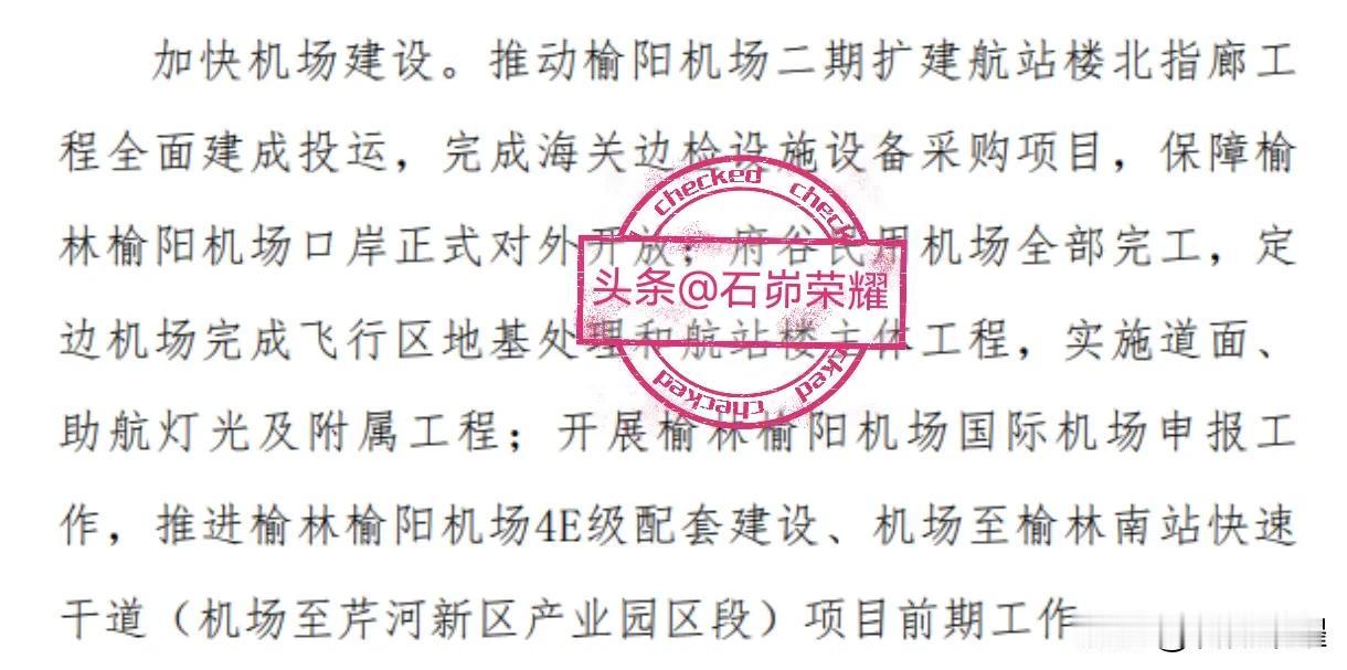 2025年榆林机场建设亮点多:申报榆阳国际机场、府谷机场全部完工、定边机场完成飞行区地基处理等 榆林市交通运输局2025年工作任务:加快机场建设中提到“推动榆阳机场二期扩建航站楼北指廊工程全面建成投运,完成海关边检设施设备采购项目,保障榆林榆阳机场口岸正式对外开放;府谷民用机场全部完工,定边机场完成飞行区地基处理和航站楼主体工程,实施道面、助航灯光及附属工程;开展榆林榆阳机场国际机场申报工作,推进榆林榆阳机场4E级配套建设、机场至榆林南站快速干道(机场至芹河新区产业园区段)项目前期工作。” @石峁荣耀:榆阳国际机场申报成功后将是陕西第二个、呼包鄂榆城市群第四个国际机场。