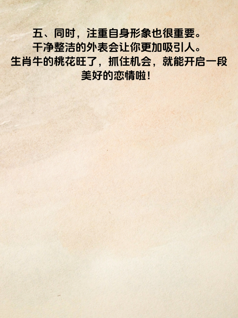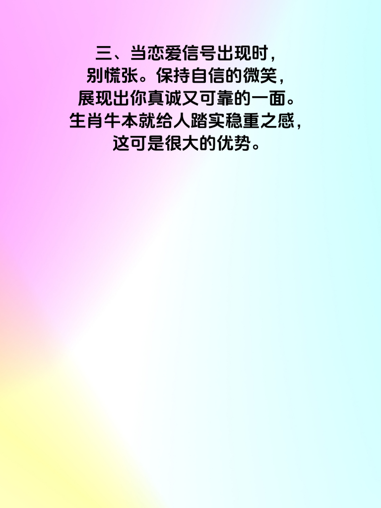 一、生肖牛的朋友们,最近桃花可是格外旺盛哦!恋爱信号频频闪现,你察觉到了吗? 二、首先,要留意自己生活中的一些微妙变化。也许会突然收到一些神秘的问候,或者在某个场合,有异性总是不自觉地向你投来关注的目光。这可能就是桃花旺的迹象呢。 三、当恋爱信号出现时,别慌张。保持自信的微笑,展现出你真诚又可靠的一面。生肖牛本就给人踏实稳重之感,这可是很大的优势。 四、主动出击也是个不错的办法。找机会和那个让你心动的人多交流,分享彼此的兴趣爱好。记住,真诚是打开爱情大门的钥匙。 五、同时,注重自身形象也很重要。干净整洁的外表会让你更加吸引人。生肖牛的桃花旺了,抓住机会,就能开启一段美好的恋情啦!