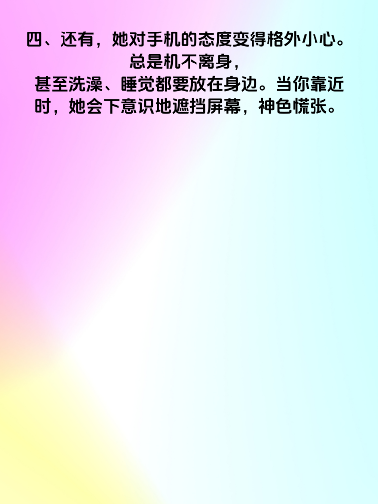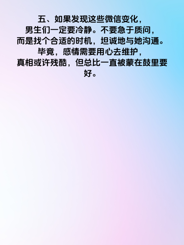 一、在感情的世界里,出轨的阴影总是让人痛心疾首。对于男生而言,提前察觉一些迹象,或许能避免更大的伤害。今天就来聊聊,当她出轨前,微信可能会出现的一些变化。 二、首先,她的聊天频率可能会突然改变。原本和你无话不谈,现在却常常抱着手机,回复你的消息变得迟缓。她开始频繁地与某个特定的人聊天,甚至背着你偷偷删除聊天记录。 三、再者,朋友圈的动态也能透露蛛丝马迹。她可能不再像以前那样积极分享生活点滴,或者开始设置一些奇怪的分组。原本只对你可见的某些内容,现在可能对所有人开放,似乎在刻意营造一种新的形象。 四、还有,她对手机的态度变得格外小心。总是机不离身,甚至洗澡、睡觉都要放在身边。当你靠近时,她会下意识地遮挡屏幕,神色慌张。 五、如果发现这些微信变化,男生们一定要冷静。不要急于质问,而是找个合适的时机,坦诚地与她沟通。毕竟,感情需要用心去维护,真相或许残酷,但总比一直被蒙在鼓里要好。