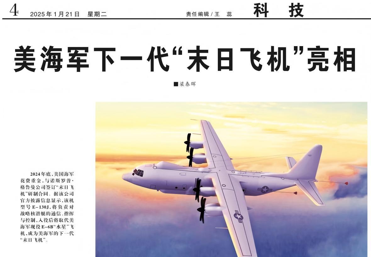 神秘的“高新-14”——从外观上来看,很是有点平平无奇。不过,最新有消息指出:该机的主要任务是为陆上指挥中心与大洋深处的潜艇之间提供中继通讯,有些类似于米国海军冷战时期的EC-130Q TACAMO战略潜艇通讯机,参见图2~3。大家注意图3,该机尾部拖曳着与水下潜艇联络的可收放式通讯天线(天线可长达数公里),天线末端有红色的喇叭状整流罩。 这个EC-130Q TACAMO为什么要称作“战略潜艇通讯机”呢?原来,米帝是准备在核战争爆发时,通过该型机联系美国海军的弹道导弹核潜艇,立即向苏联发射潜射弹道导弹。同时,也命令在水下跟踪苏联核潜艇的美国各型攻击核潜艇,马上击沉苏艇。总的来说,就是彻底掀桌子了。所以,该型飞机又被称为“末日飞机”(参见图4)。 咱们说的只是米帝的EC-130Q TACAMO的功能啊,其他都是猜测~