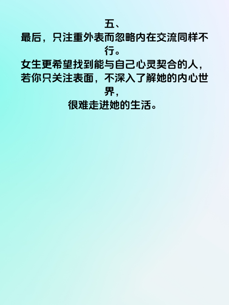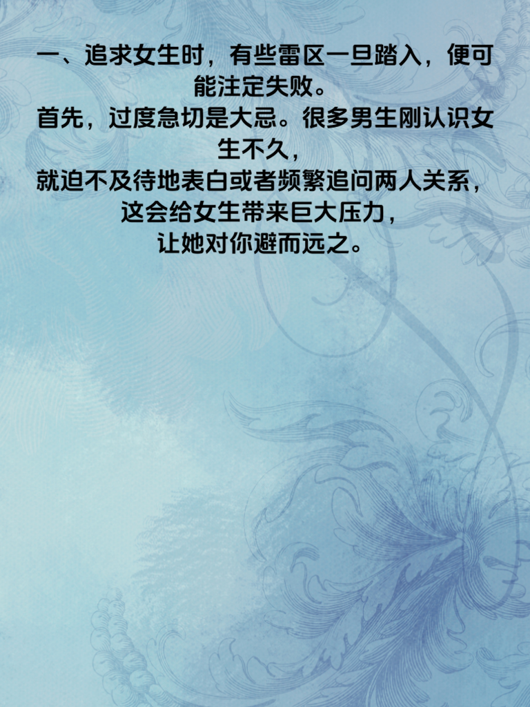 一、追求女生时,有些雷区一旦踏入,便可能注定失败。首先,过度急切是大忌。很多男生刚认识女生不久,就迫不及待地表白或者频繁追问两人关系,这会给女生带来巨大压力,让她对你避而远之。 二、不尊重她的想法和感受也万万不可。比如在讨论事情时,总是强行让她接受你的观点,忽略她的意见,这会让她觉得你不重视她,从而心生反感。 三、还有,过度吹嘘自己也是雷区之一。适当展示自身优点是好的,但如果一味夸大,说些不切实际的大话,很容易被女生看穿,觉得你虚伪。 四、再者,缺乏耐心也会导致追求失败。女生可能在某些时候反应慢或者需要时间考虑,这时如果你不耐烦,催促她做决定,她可能就会对你关上心门。 五、最后,只注重外表而忽略内在交流同样不行。女生更希望找到能与自己心灵契合的人,若你只关注表面,不深入了解她的内心世界,很难走进她的生活。