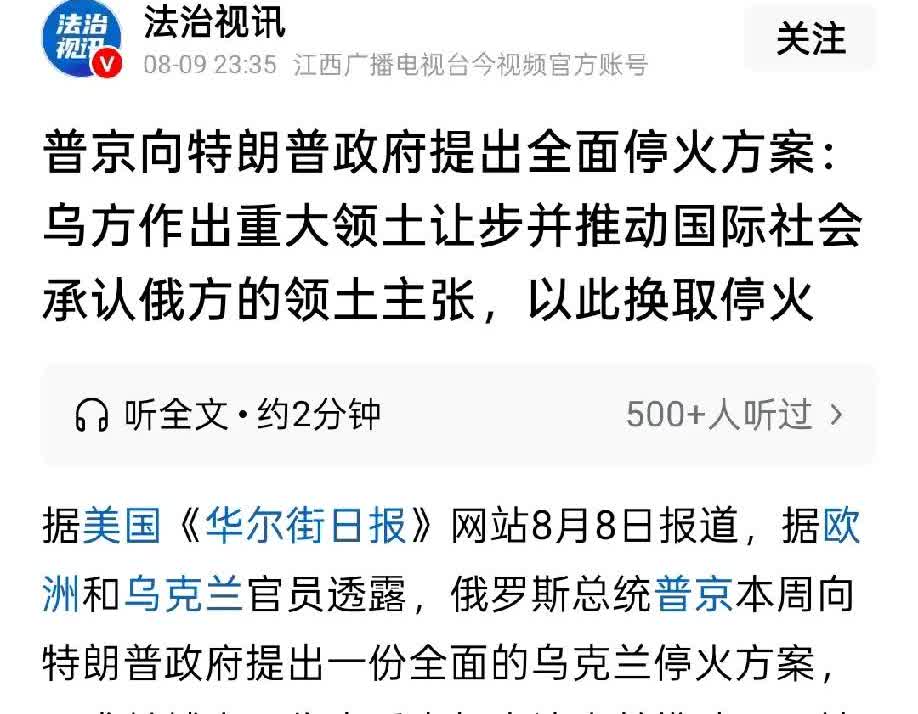 普京正式宣布,只要乌克兰割让领土,立即停战。 俄美首脑即将会晤,普京对外放风,其实是在试探特朗普的底线。 大帝说,只要乌军从俄军已经占领的四州完全撤离 ,并承认放弃俄罗斯已经占领的土地,俄乌战争就可以结束。 打了将近四年,俄罗斯不可能空手而归,割走乌东富饶地区本来就是大帝的最初目标。如果进展顺利,拿下基辅也是必然的。但因为战争消耗巨大,经济无法承受,再加上西方的制裁,还有特朗普最后的期限,俄只能大发慈悲,只要乌东地区。 关键是,这样的要求,乌克兰会不会答应呢? 如果不答应,停战协议还是签不了,仗还要继续下去。 这个时刻,就看川普的态度了。