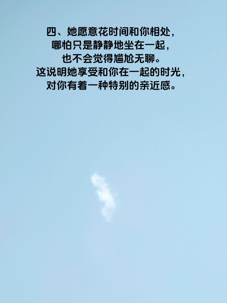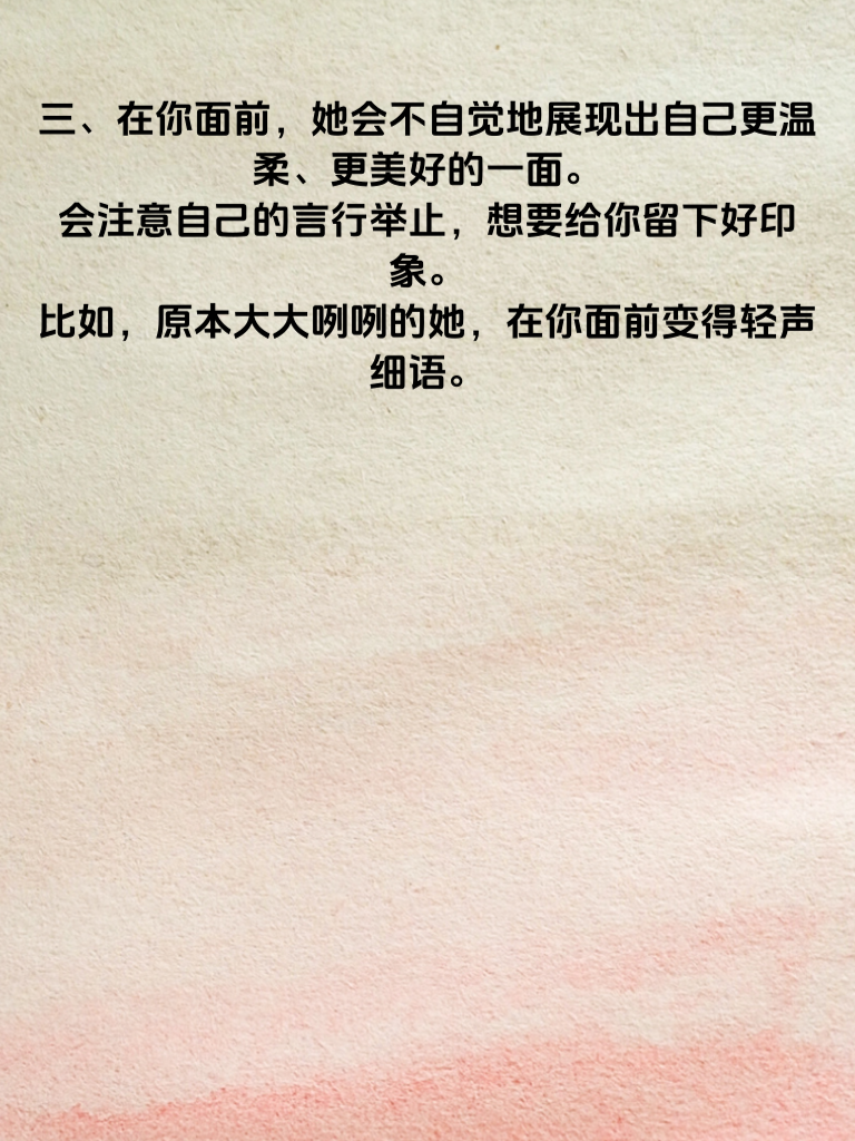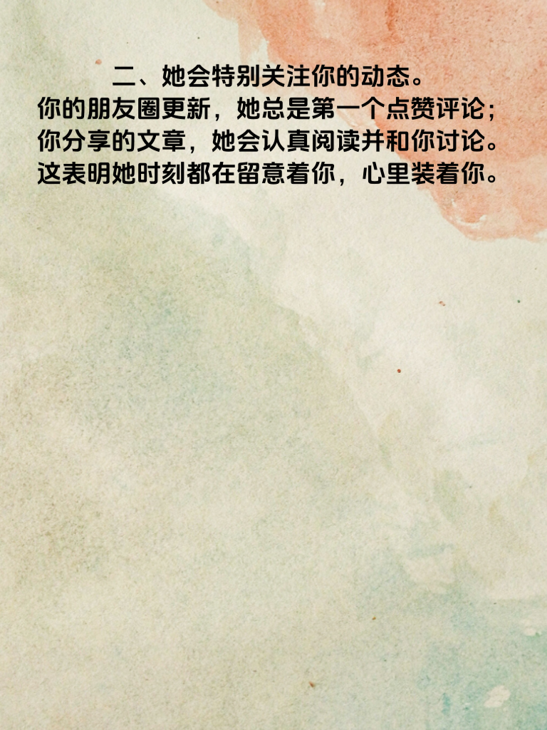 一、女人心,海底针?其实也有迹可循。当她总是主动找你聊天,无论是分享生活琐事,还是寻求你的建议,这很可能是她对你有意的信号。她渴望与你交流,想更多地了解你,走进你的世界。 二、她会特别关注你的动态。你的朋友圈更新,她总是第一个点赞评论;你分享的文章,她会认真阅读并和你讨论。这表明她时刻都在留意着你,心里装着你。 三、在你面前,她会不自觉地展现出自己更温柔、更美好的一面。会注意自己的言行举止,想要给你留下好印象。比如,原本大大咧咧的她,在你面前变得轻声细语。 四、她愿意花时间和你相处,哪怕只是静静地坐在一起,也不会觉得尴尬无聊。这说明她享受和你在一起的时光,对你有着一种特别的亲近感。 五、当你遇到困难时,她会真心地为你着急,给你鼓励和支持。这是她在乎你的表现,她希望能成为你生活中的温暖力量。抓住这些信号,勇敢去追求属于你的爱情吧!