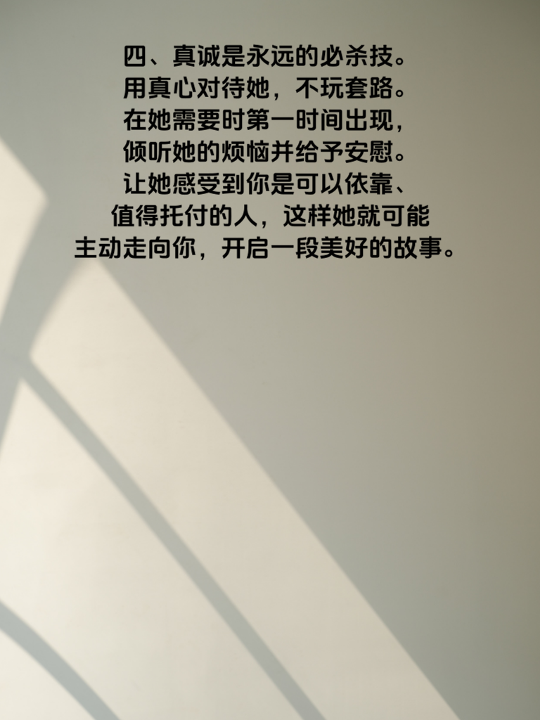 一、想要让她主动来追你,首先得展现独特魅力。每个人都有闪光点,挖掘并放大自己的优点,无论是才华横溢、幽默风趣还是温柔体贴,让她在人群中一眼就能注意到你。比如,你擅长绘画,那就偶尔在社交平台分享自己的作品,吸引她的目光。 二、细节之处见真章。记住她的喜好,生日、纪念日等重要日子精心准备惊喜。她提到喜欢的一本书,你悄悄买来放在她能看到的地方。一起吃饭时,贴心为她拉椅子、递纸巾,这些小举动会让她心里暖暖的。 三、保持适当距离也很关键。别追得太紧让她有压力,给彼此一些空间去做自己喜欢的事。当她发现你有自己丰富的生活,会更被你吸引。同时,偶尔制造一些小偶遇,加深她对你的印象。 四、真诚是永远的必杀技。用真心对待她,不玩套路。在她需要时第一时间出现,倾听她的烦恼并给予安慰。让她感受到你是可以依靠、值得托付的人,这样她就可能主动走向你,开启一段美好的故事。