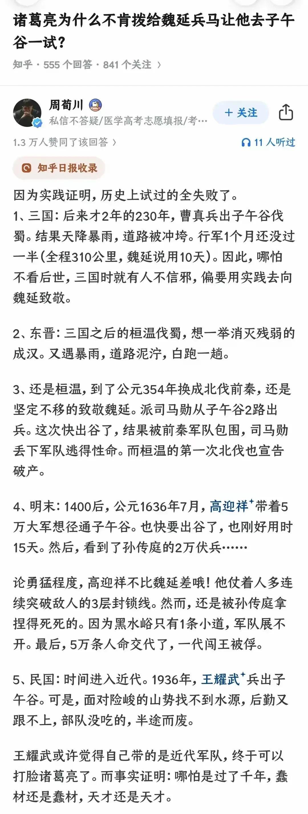 子午谷奇谋,能否成功? 延愿得精兵五千,取路出褒中,循秦岭以东,当子午谷而投北,不过十日,可到长安。 有人实践过~~~~ 说魏延能胜,真的不太可能的。 汉制一斤粮两斤草,一名士卒行役三日就要补给一次。