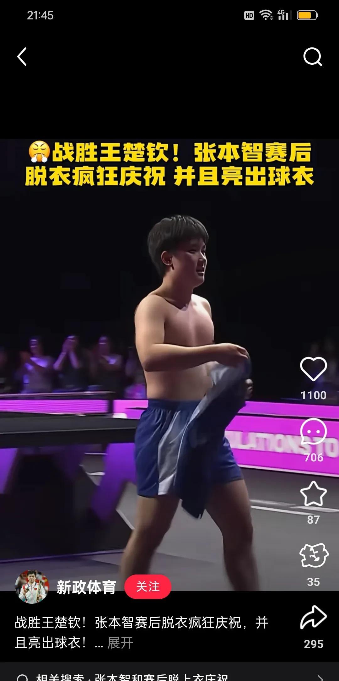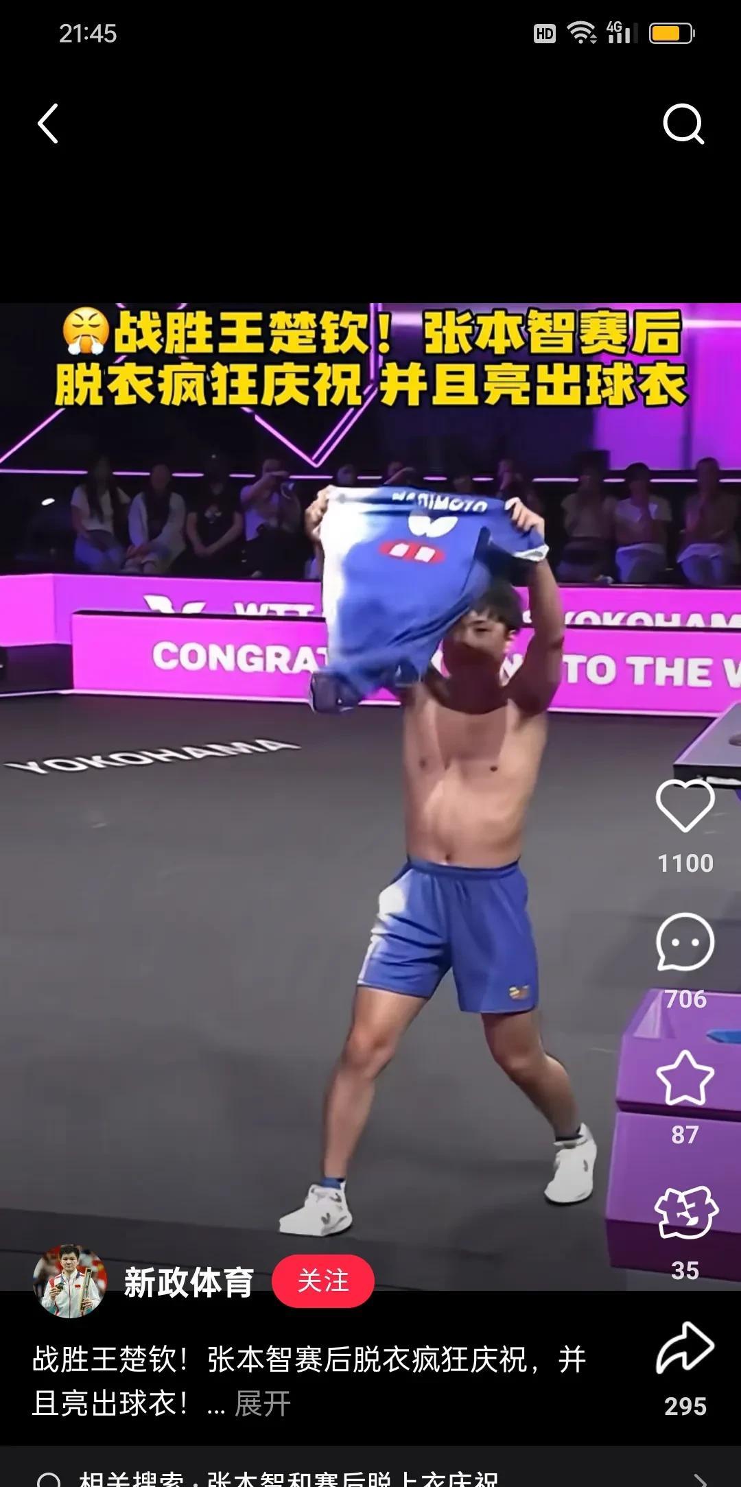 张本智和WTT横滨冠军赛战胜王楚钦后,脱衣庆祝! 在今天的张本智和已经不再是以前那个胡喊乱叫的张本智和了,人家进步很多。 今天张本智和策略很好,不像以往拼进攻拼速度,而是打起防守反击。王楚钦首局领先被逆转后有些着急,失误太多了。也许他没有想到今天张本智和改变打法,甚至第六局有点起势时对手会医疗暂停。总之,对手打得好,祝贺。下次再来吧。