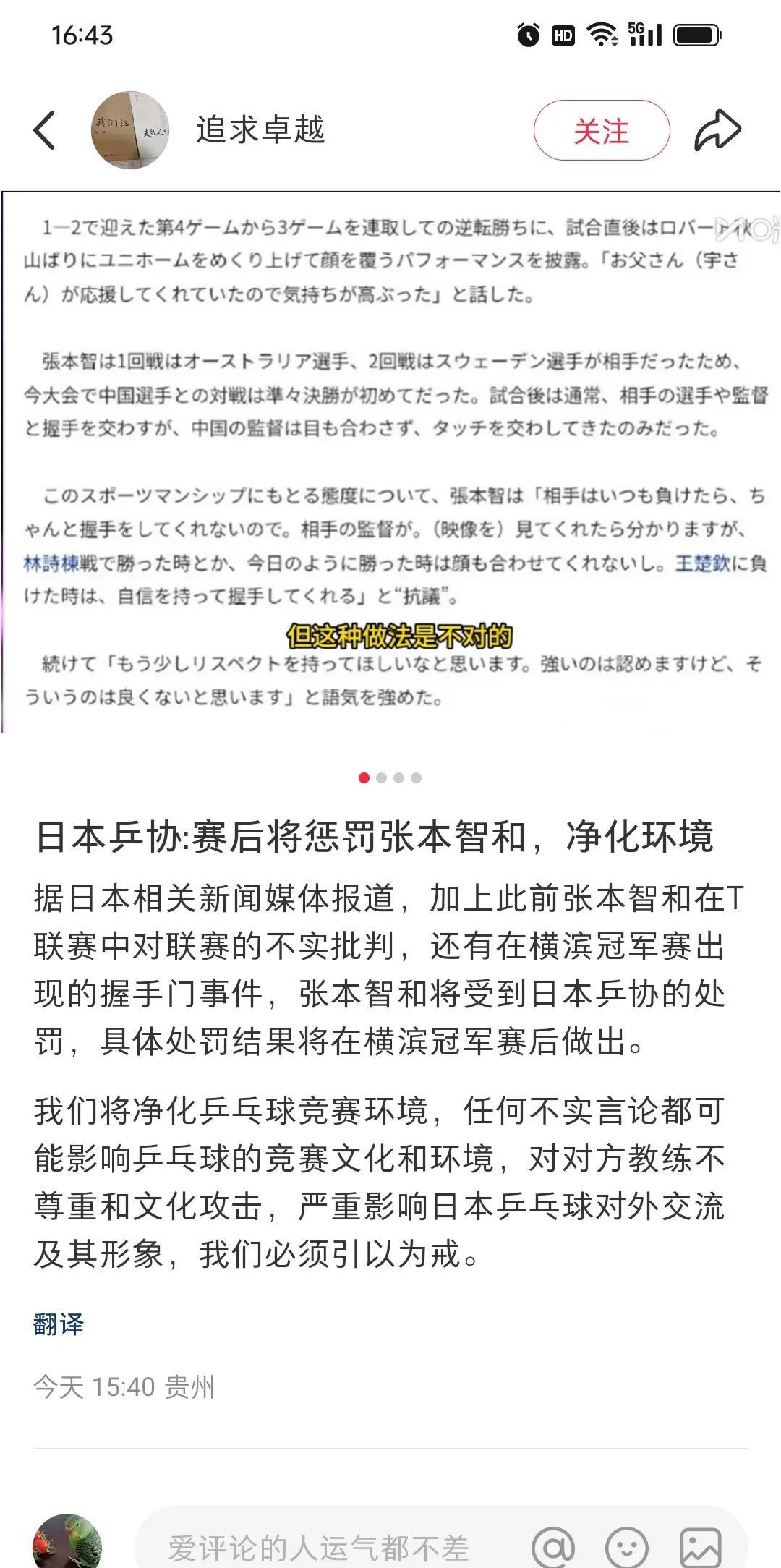 对于张本智和控诉王皓对他不尊重后,他父亲也出来表态了,说王皓对于他儿子确实不尊重! 可是日本乒协却不护犊子,说等待比赛结束后会对张本智和进行处罚,以净化比赛环境! 张本硬实力还是牛的,就是最近频频发表一些控诉,引起了网友的不满。两兄妹从小在日本长大 ,一个不满握手 , 一个怀疑自己本国队员拖延战术 ,还取关 早田希娜 。 #张本智和父亲# #张本智张本美和# #王皓# #张本智和4-1贾哈率先闯入决赛#