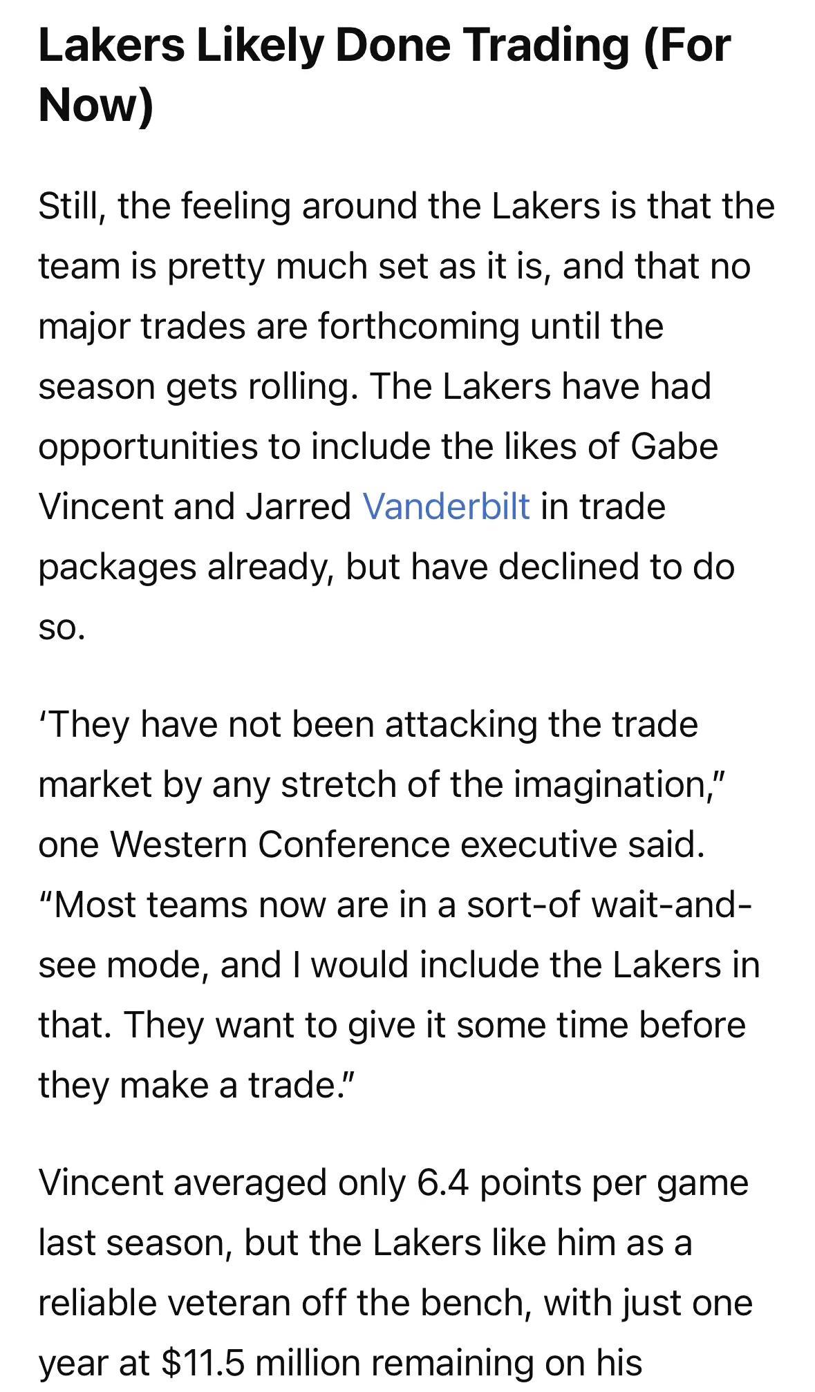 低级别消息Sean Deveney:湖人队短期不会有交易,湖人队内部的想法是,球队目前的阵容已基本确定,在赛季开始前不会有重大交易。 湖人队此前已有机会将文森特和范德比尔特等人纳入交易方案,但他们都拒绝了。 一位西部联盟的高管表示:“他们根本没有积极进军交易市场。现在大多数球队都处于一种观望状态,我认为湖人队也在其中。他们希望在进行交易之前再等等看。”
