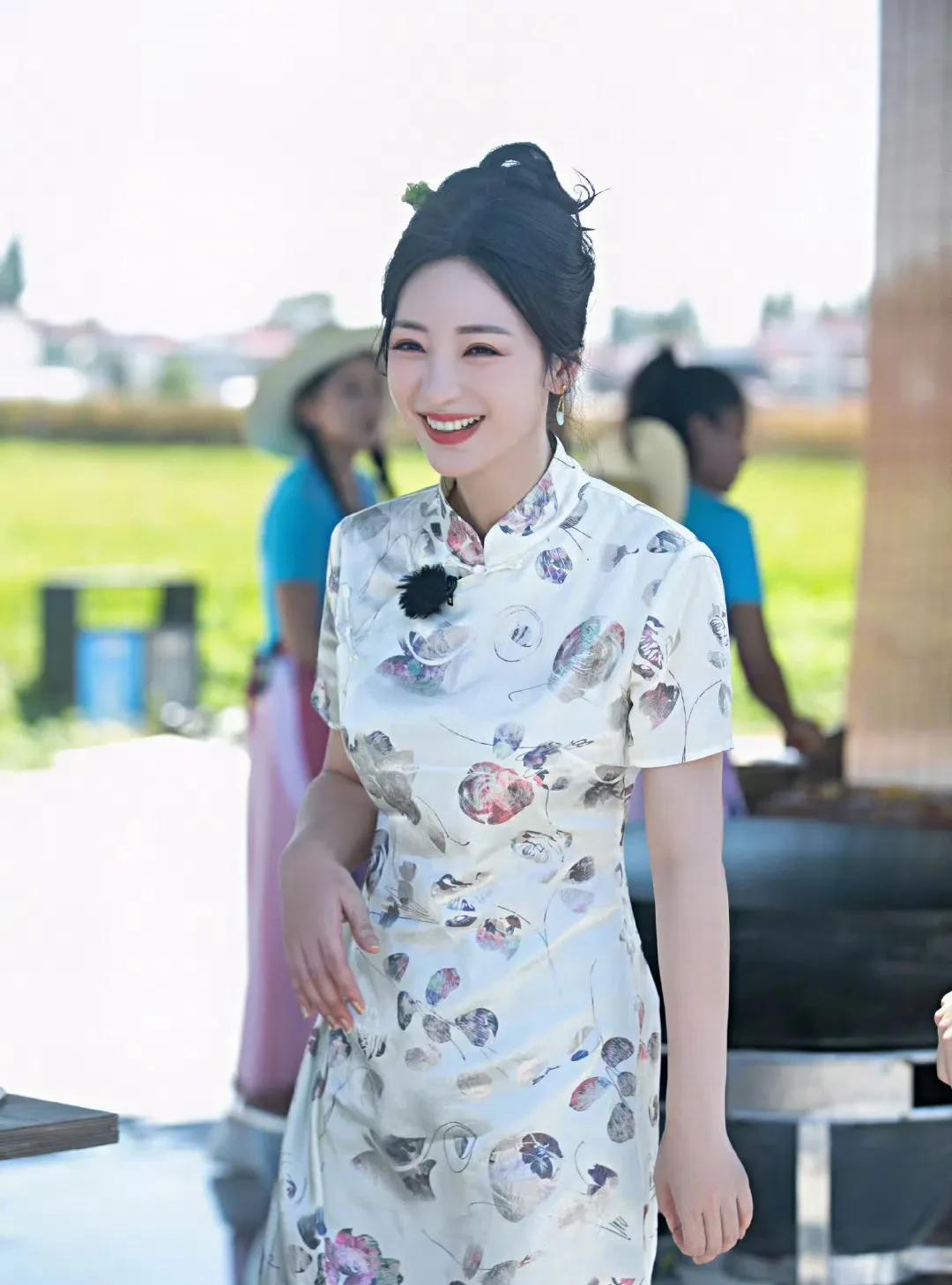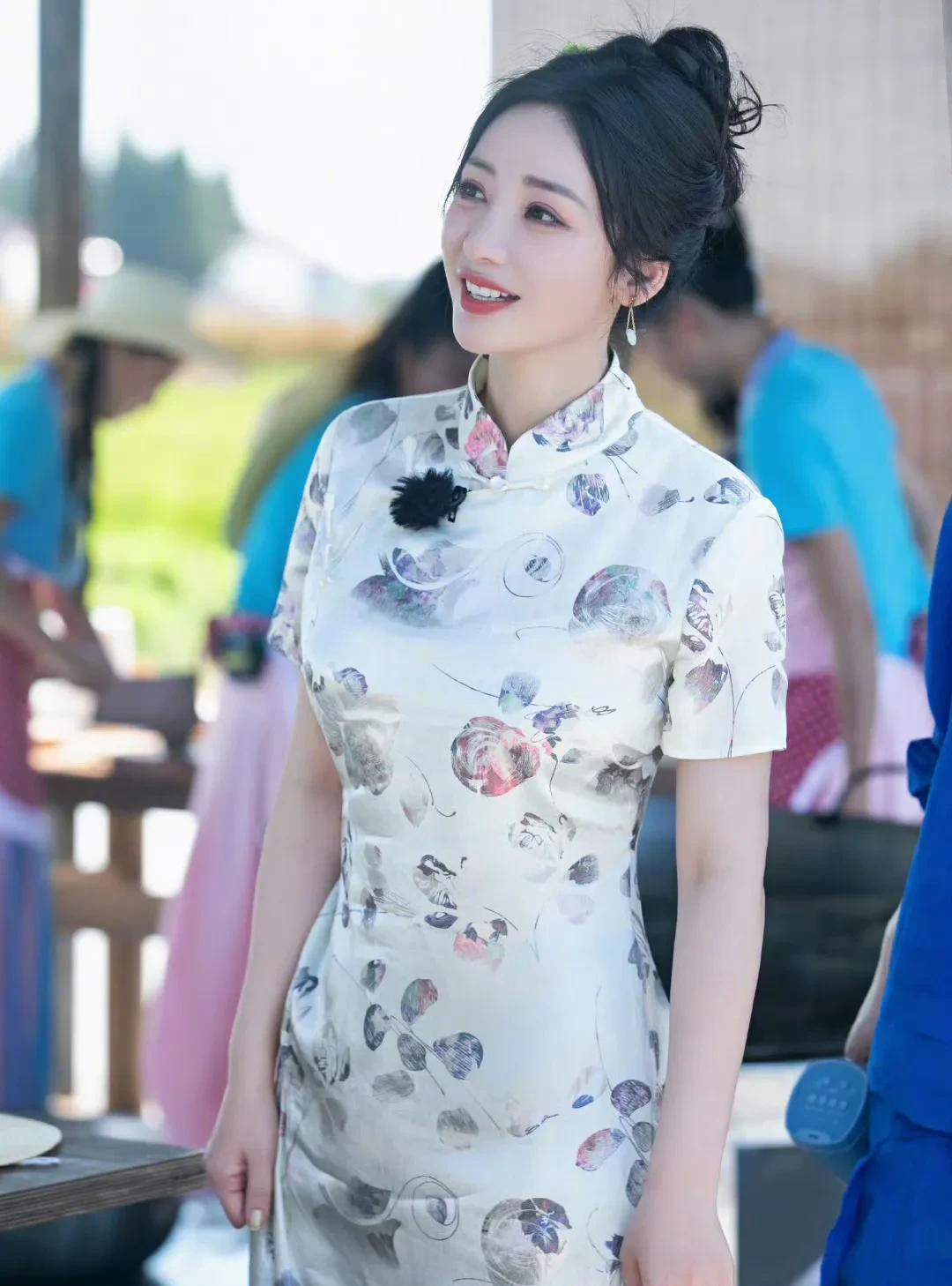 柳岩穿印花旗袍,盘发戴小花,笑出甜酒窝,身材凹凸藏不住,这东方韵味直接把田园美炸