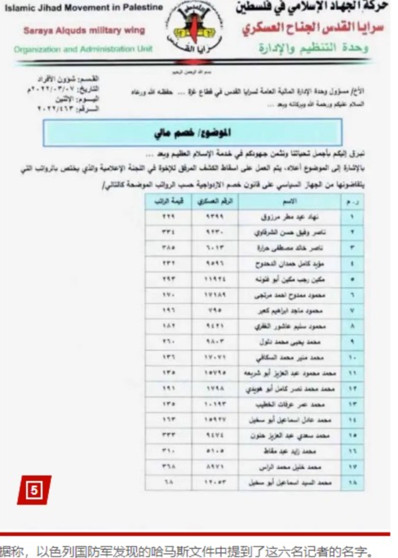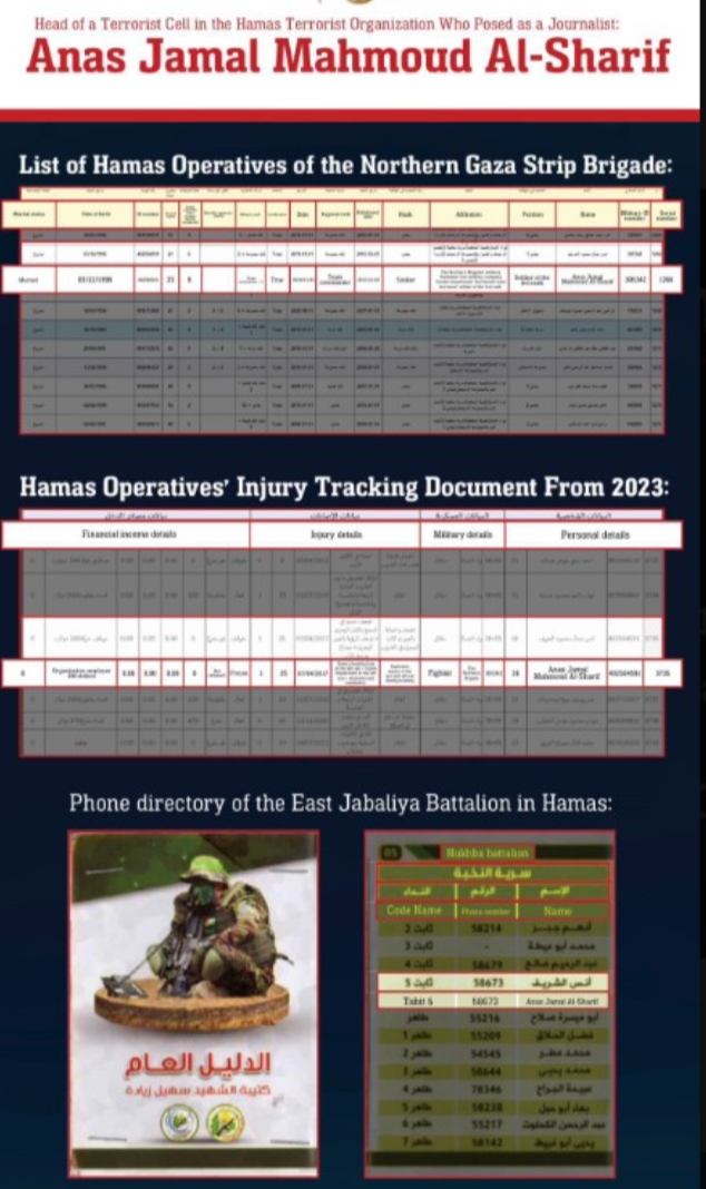 被以军清除的辛瓦尔的亲密战友、哈马斯宣传员、半岛电视台记者阿纳斯·谢里夫的身份信息: 出生日期:1996年12月3日 军事身份证号码:305342 身份证号码:402504591 加入哈马斯日期:2013年12月3日 组织隶属:哈马斯东加巴利亚营 所担任的职务:哈马斯定向火箭炮排中一个恐怖分子小组的负责人 在缴获的哈马斯名册、训练名单和工资记录中,谢里夫赫然在列,以军已于2024年10月公布了此人的哈马斯身份,此次不是误炸。