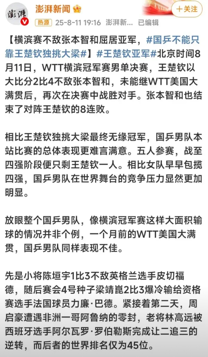 国乒,不能只靠王楚钦独挑大梁,终于有媒体忍不住“忠言逆耳”,二王一马时代、三剑客