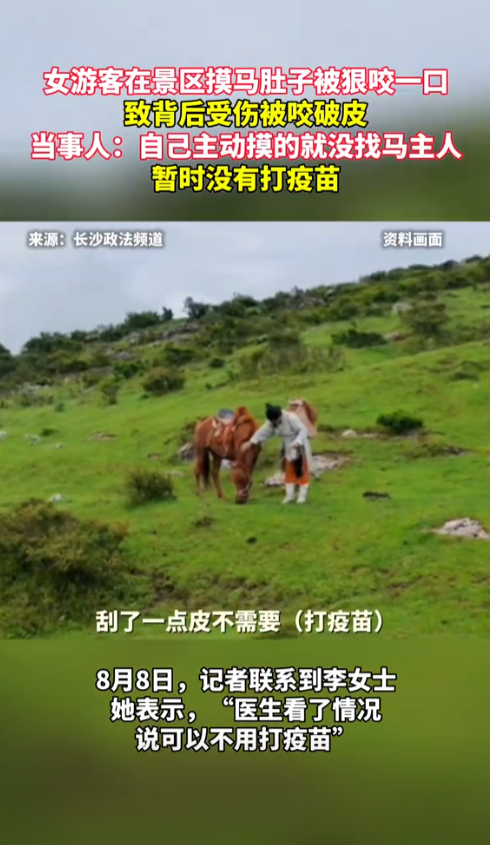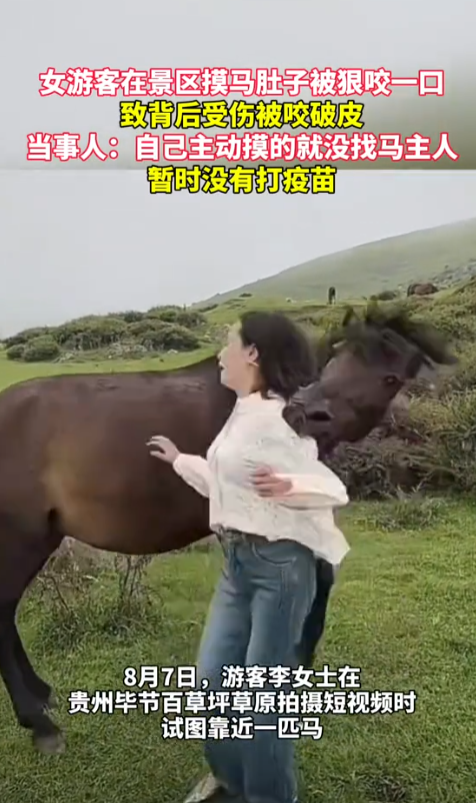 贵州毕节,女子在景区游玩时,见一匹马正在吃草,便靠近马准备拍摄视频。期间,女子没忍住摸了一下肚子,结果悲剧了,马受惊后咬了女子的后背。女子称,是自己主动摸的,没好意思找马的主人,也没有打疫苗。 根据杭州网8月9日的报道,女子是一个明事理的人,没有一出事就讹人,事情发生在6日,贵州毕节百草坪草原景区,阳光倾洒,绿草如茵,成群的牛羊马在草原上悠然自得。 游客李女士置身于这如诗如画的美景中,被眼前吃草的马儿吸引,想着拍个独特的视频,她慢慢朝着马靠近。 起初,马并未对她的靠近有特别反应,这让李女士胆子大了起来,她心想,这马看起来温顺,摸一下应该没事。 于是,她伸出手,轻轻摸向马的肚子,可谁能料到,就在她手指触碰到马肚子的瞬间,原本安静吃草的马像被点燃的火药桶,猛地扭头,对着李女士的后背就是一口。 这变故来得太快,李女士根本来不及躲避,李女士事后回忆,当时就感觉后背一阵剧痛,心里“咯噔”一下,知道坏事了。 她查看伤口,发现皮肤被刮破了,好在她穿着衣服,衣服没被咬破,只是表皮受了点伤,李女士心里清楚,是自己主动去摸马的,便觉得不好意思找马的主人理论。 她没有第一时间去医院,而是在网络上发布视频询问:“家人们,要不要打破伤风?” 第二天,李女士联系了医生,医生查看情况后,表示可以不用打疫苗,这才让李女士稍稍松了口气。 这事儿在网上传开后,网友们纷纷发表看法,有的网友调侃道:“本来就不该找马主人麻烦,这女孩有良心!” 还有网友分享自己经历:“要打疫苗,我小时候社牛就是被马咬了,当时没有去打疫苗,现在变成了牛马。” 虽是玩笑话,却也提醒着大家被马咬伤后及时处理的重要性,也有网友科普,马的腹部是敏感脆弱区域,陌生人突然触碰,会触发马强烈的防御本能,咬、踢是它们常见的自我保护反应,尤其是马在休息或进食时,警惕性更高,攻击风险更大。 还有网友根据视频中马肚子较大推测,这匹马可能处于孕期,孕期的马对外界接触会极度敏感,充满戒备和敌意。 这些意外给人们敲响了警钟,景区里的动物即便看似温顺,但其野性和不可预测性始终存在,动物有自己的习性和敏感点,我们不能仅凭主观臆断,随意靠近、触摸。 李女士的遭遇,是一个意外,也是一个提醒,在景区游玩,我们要对动物保持敬畏之心,遵守景区规定,不随意挑战动物的“底线”。 同时,景区也应加强管理,设置明显的警示标识,提醒游客注意安全,希望大家都能从这些事件中吸取教训,在享受景区美景和与动物互动乐趣时,将安全放在首位,避免类似的意外再次发生。 大家怎么看这类景区动物伤人事件呢?欢迎留言讨论。