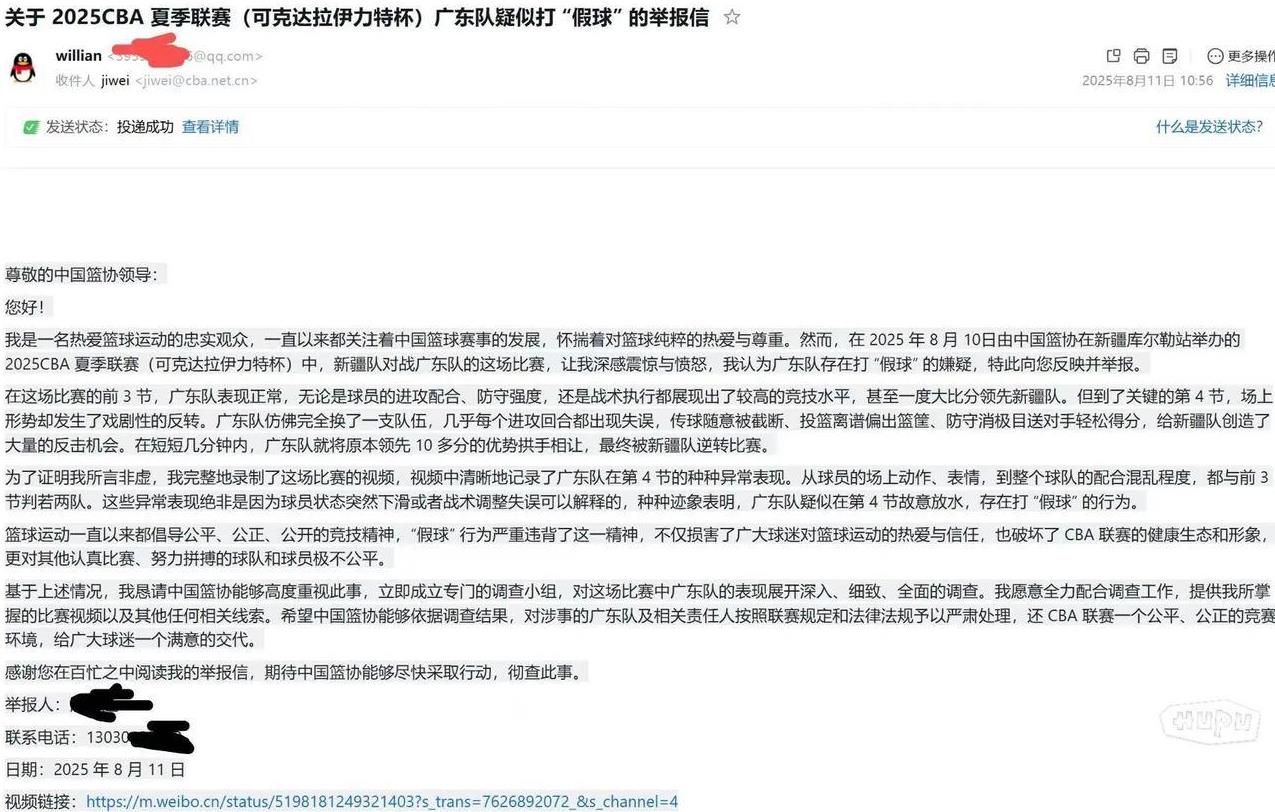 杜锋这次是彻底摊上事了!广东球迷已经写举报信到篮协投诉杜锋打假球! 而且不只有一