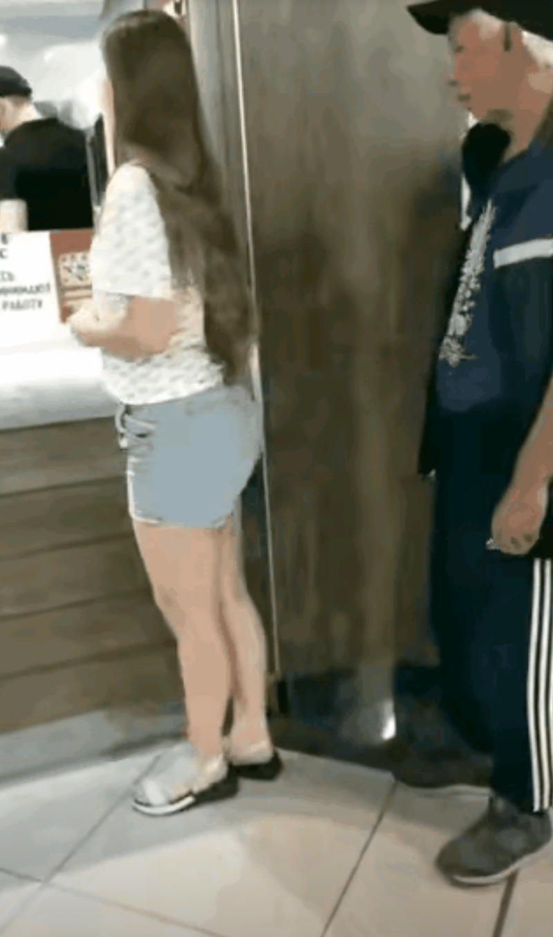 坏人变老了!在一售卖窗口,前面有一年轻女子穿着短裤,在排队,身后有老头,大概有七
