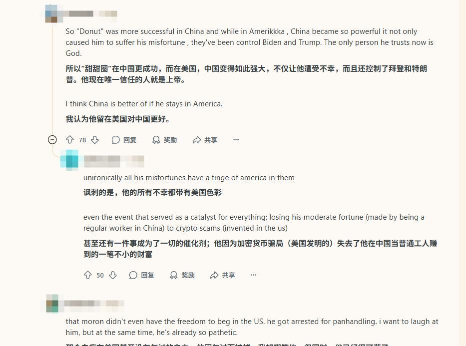 “甜甜圈”王伟恒这下彻底火了,美国最大的网络论坛红迪网上充斥着有关他的传说,不光咱中国人,合着美国的乐子人也爱看电子宠物。 “所以‘甜甜圈’在中国其实混得更成功。而润到美国之后,看到中国变得如此强大,他变得更加不幸了。他现在连拜登和川普都信不过了,他现在唯一信任的人就是上帝。我认为他留在美国对中国其实更好。” “我听说这个白痴在美国甚至连乞讨的自由都没有。他因为要饭而被警察抓了。我想嘲笑他,但同时,他已经很可悲了。” “离开中国梦,走进美国噩梦。”