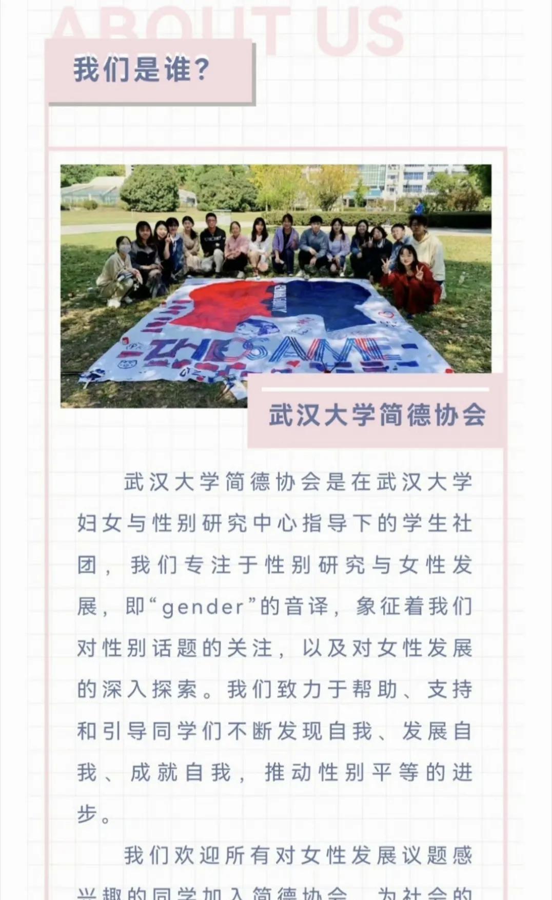 现在终于明白为什么武汉大学这些年出了那么多打女拳的人物了,因为武汉大汉里面有一个“简德协会”,而这个协会全部都是女的,明其名曰是研究性别研究和女性发展,实际上就是一群女权主义者凑在一起,想着怎么利用所谓女性弱势群体去欺负别人。据知情人说,这个所谓的简德协会有外资的资助,就是为了发展这些打女拳的女大学生,利用她们这些人的言论去影响更多的人。