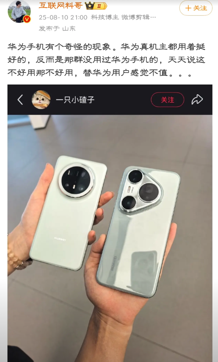 手机圈一直有个怪现象,那就是用着华为手机的机主没有说什么不好的,但是,不是华为手机机主的网友们,那可着急了,天天说这个不好那个不好的,还说人家华为手机机主是韭菜,冤大头,智商税什么的。 就差帮人家真机主去起诉华为了,可着急了,比真机主都着急,一直在替华为手机真机主感到不值