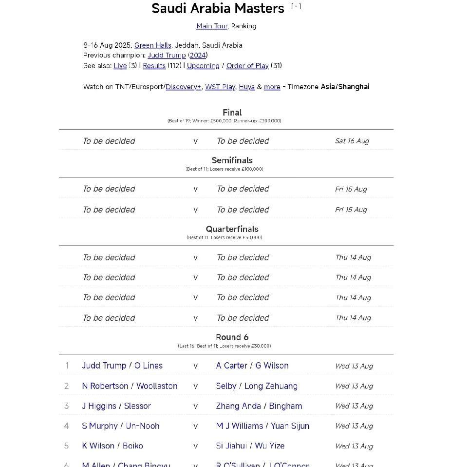 赵心童,沙特大师赛夺冠之路! 8月13日00:30,斯诺克沙特大师赛第五轮,世锦赛冠军赵心童对阵斯蒂芬·霍尔沃斯,后者在第四轮5-3淘汰了中国球员周跃龙。 第六轮,赵心童大概率对阵克里斯·韦克林。第七轮,赵心童可能对阵丁俊晖或者巴里·霍金斯。第八轮,赵心童大概率对阵凯伦·威尔逊或者火箭,晋级决赛将会非常困难。决赛可能对阵贾德·特鲁姆普或者马克·塞尔比。 第八轮是最大的考验! 沙特大师赛已经晋升为斯诺克四大赛之一,要想成为大满贯球员,赵心童必须五战五胜夺得本项赛事的冠军。