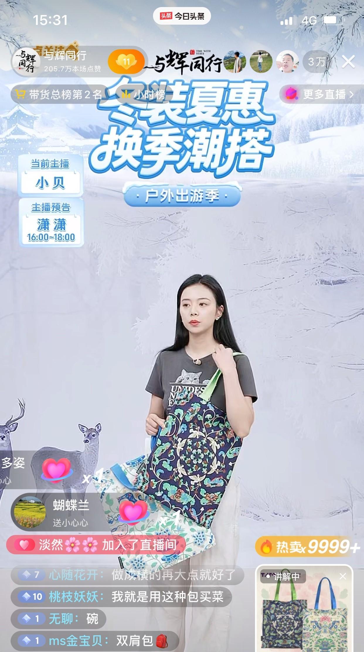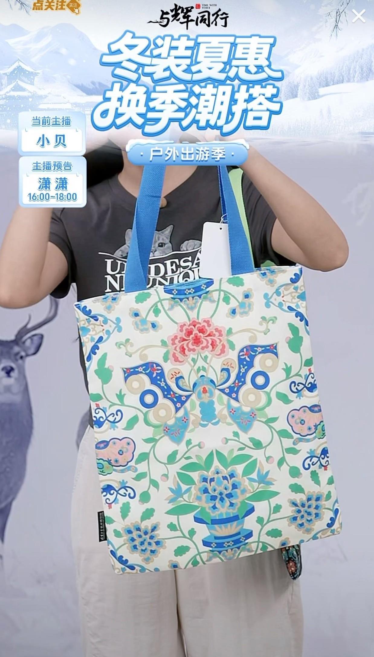 又见爆款包包! 3万+在线,9999+销售单量! 这是与辉同行直播间刚刚诞生的名场面! 谁能想到在一个周二下午三点半 传统直播间普遍认为的“卖货遍低谷时间” 与辉同行直播间竟然有3万+在线 由小贝推荐的一款 来自清华大学艺术博物馆的包包 成了今天的百万爆款! 截止到下午三点半两款艺术帆布包 大卖2.4万单!销量直接接近100万! 包包在与辉同行直播间好像有无限的魔力! 不管哪款包包基本都能成爆款 无论是彪哥家的设计款, 还是这次清华大学艺术博物馆的包包 只要有特色,有艺术气息 就有人愿意为包包买单! 这两款包包花色很独特, 一款是花间蝴蝶图案,一款是晴鸽放春图案 果然民族的也是世界的 老祖宗的审美留下的艺术传承就是有品位 短短几分钟的介绍 就把包包卖断货,直播间销售直接卖到 排行总榜第二! 不得不服同行粉丝们的购买实力! 这一次,清华大学艺术博物馆算是收益了得! 这一波销售带宣传 算是彻底把这款文创产品带爆出圈! 静等接下来收到包包的爱辉区粉丝们的 各种各样的精彩买家秀吧! 为小贝点赞! 也为这款国风美的包包出圈点个大大的赞吧! 你看好这款包包没?