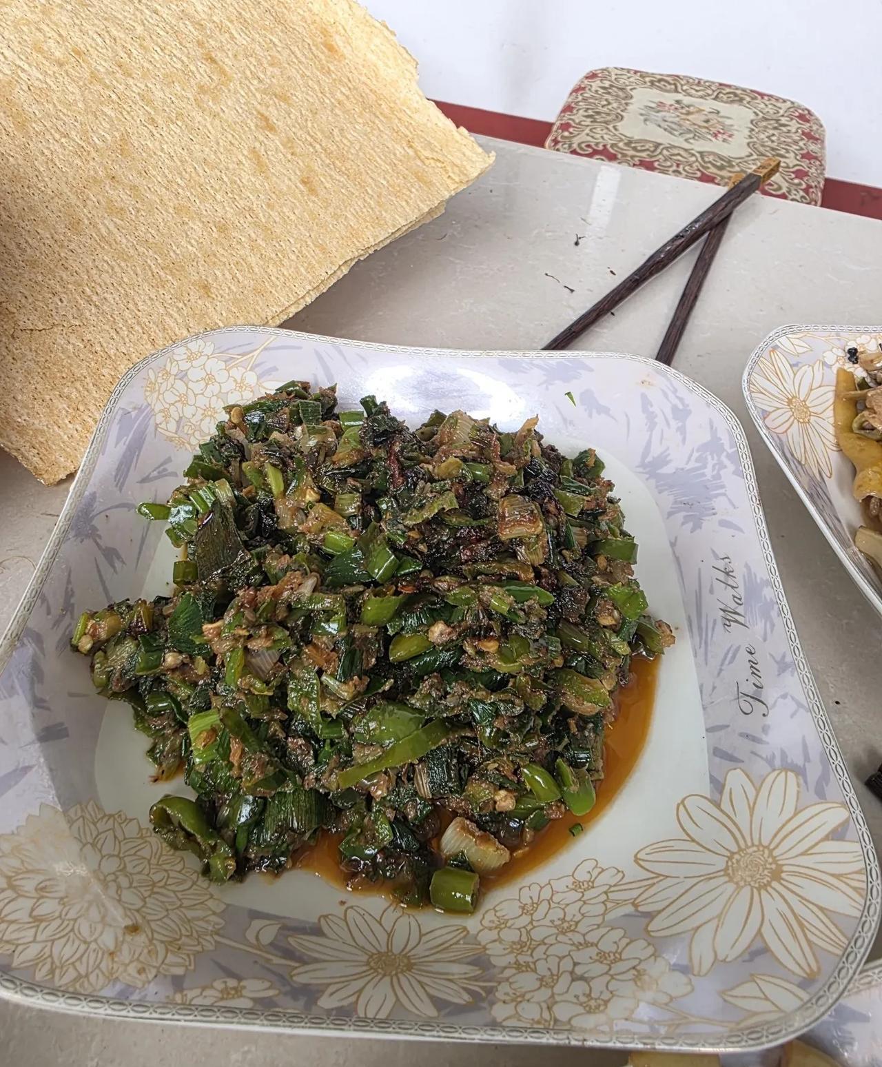 乡村叙事:简单、可口又健康的饮食…… 村里乡亲吃饭,不像城里人那么讲究。自己摊煎饼或者蒸馒头,偶尔也买,但次数不多。乡亲们总说东西还是自己做的放心,吃起来踏实。 吃菜更不讲究,家里有什么炒什么,更多的时候取决于房前屋后种了什么。不想去菜园摘菜了,就到房前空地摘几个茄子或者辣椒,洗洗炒炒,一顿饭就过去了。 如果不忙,也会多做几个菜,尤其夏天,菜园的菜都吃不了,而且品种还多,想吃什么就去菜园摘回来,煎炒烹炸,乡亲们的厨艺都不错,都能做一手很好的庄户饭。 今天中午,二嫂做了两个菜,一个是虾酱炒大葱和辣酱,一个烤芸豆炒肉。这俩菜都是卷煎饼的好菜,所以今天中午我吃得特别饱。