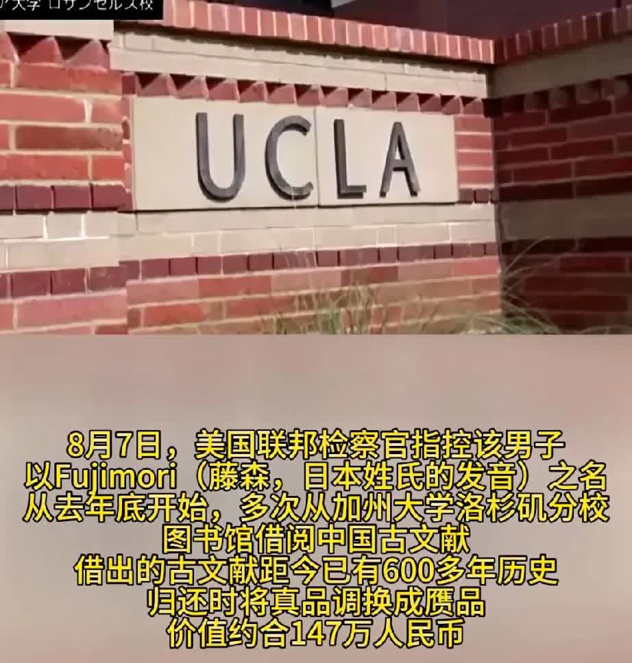 这位华人兄弟是真的猛啊! 日媒于8月8日报道称: 华人男子冒用日本人姓名从美国大学借走中国古代文献将真品带回中国,用赝品归还。 8月7日,美国联邦检察官指控该男子,以Fujimori(藤森,日本姓氏的发音)之名,从去年底开始,多次从加州大学洛杉矶分校图书馆借阅中国古文献,借出的古文献距今已有600多年历史,归还时将真品调换成赝品,价值约合147万人民币。 我国网友还是比较关心距今600多年的中国古文献,怎么会出现在美国的图书馆里?大家说是不是?