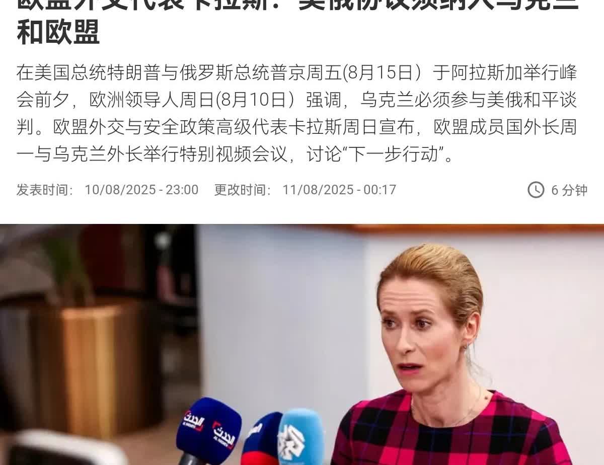 欧盟对于美俄领导人峰会划下红线!欧盟外交代表卡拉斯表示,任何美俄协议都必须包括乌克兰和欧盟,因为这关系到乌克兰乃至整个欧洲的安全。卡拉斯重申欧盟称:在为持久而公正的和平努力过程中,国际法十分明确——所有被临时占领的领土都属于乌克兰。 很显然,在美俄领导人即将会晤之际。欧洲对美俄两国划了两条红线,其一是,欧洲和乌克兰必须参与最终的停火谈判。其二是,乌克兰的领土与主权必须得到保证。无疑,对于美俄元首会晤,欧洲对于美俄两国表达了坚定的立场。但是,事实上,各国都看得很清楚,美俄两国似乎都不愿意在俄乌问题上给欧洲一个角色。 这对于欧洲无疑是一个扎心的事实。再者,欧洲坚持支持乌克兰领土与主权完整,但是,这种表态也只有口头上的意义。欧洲很显然,不能既希望俄乌战争结束,又希望这一切都没有发生过,而全部回到战争之前,这可能吗?如果按照欧洲的理解,乌克兰的领土完整依旧,乌克兰还能够加入北约,且乌克兰能够继续保留武装,那俄罗斯接受吗? 对于乌克兰领土的最终解决,要么双方立刻停火,将领土问题冻结,要么是乌克兰被迫在领土割让协议上签字。否则,绝无停火的可能性。欧洲可以划下任何原则和红线,但是国际政治的现实最终是由实力决定的。无疑,欧洲并不是对俄乌局势具有决定性影响的一方,而这就是事实。