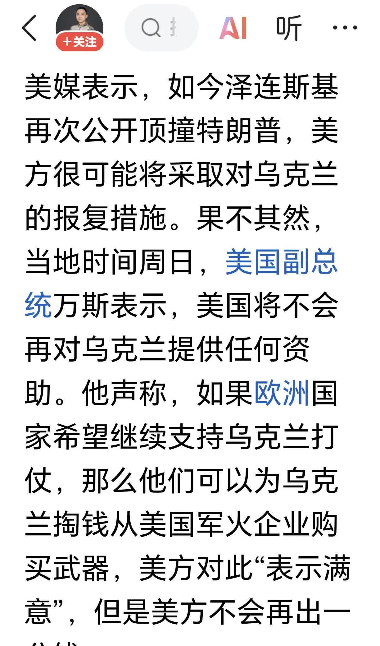 泽连斯基遇麻烦了!美国宣布对乌克兰报复。 据有关媒体昨天报道,美国可能对乌克兰采取报复性措施,缘由是乌克兰总统泽连斯基“不听话”,顶撞美国总统特朗普,搅局特朗普与普京在阿拉斯加的会晤。 二普(普京与川普)达成的领土交换和平共识,泽连斯基以违反乌克兰宪法为由,拒绝了特朗普,由此弄得特朗普在世界面前好不尴尬,颜面尽失。 昨天晚上,美国副总统万斯表示,美国将不会对乌克兰提供任何资助,如果欧洲国家希望支持乌克兰继续打仗,那欧洲国家可以掏钱从美国企业购买军火武器,但美国政府不会再掏一分钱。 在这样的形势下,泽连斯基何去何从,该怎么抉择?是坚持寸土不让,还是妥协美国?如果欧洲、北约在支持俄乌战争上离开美国这个领头羊,谁还能担当此任?欧洲、北约国家还能撑起乌克兰这个“稻草人”吗?