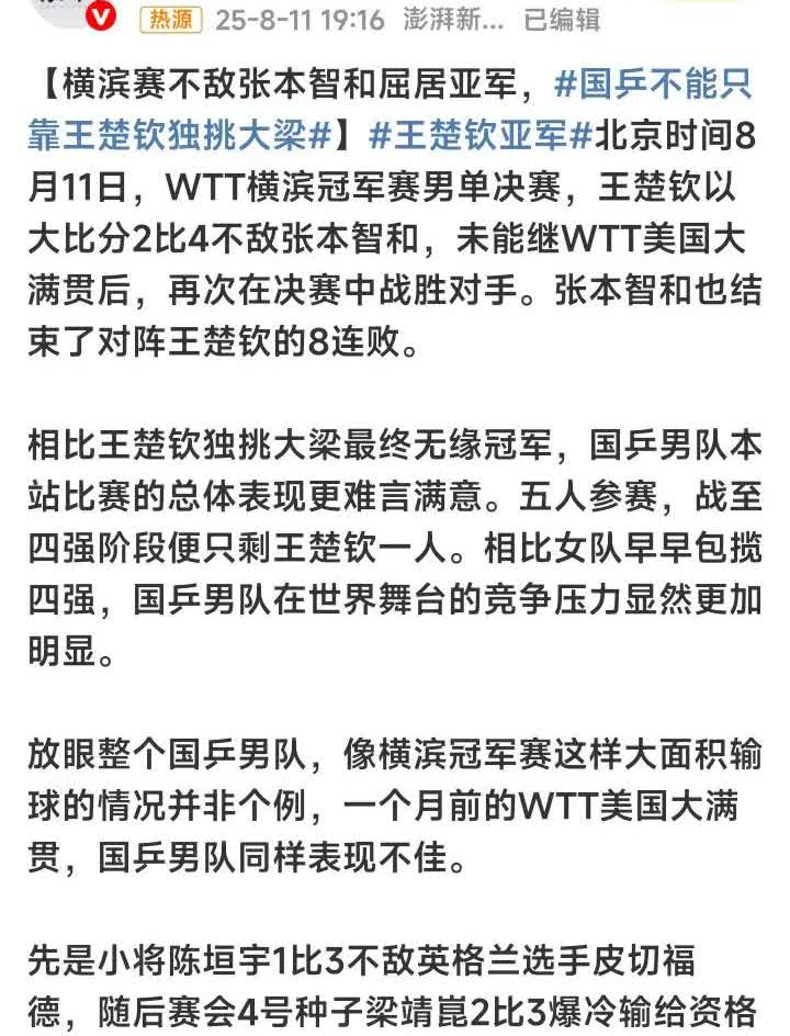 国乒,不能只靠王楚钦独挑大梁,终于有媒体忍不住“忠言逆耳”,二王一马时代、三剑客时代,以前男乒都是好几个绝对主力, 巴奥后“逼退”樊振东,就只剩下王楚钦一人,男乒已丧失团体优势,尤其是还缺乏绝对统治力。其实再厉害的人,也经不起一人独自面对外协的车轮战,更何况是王楚钦。