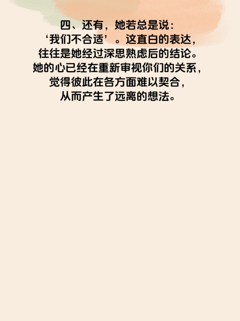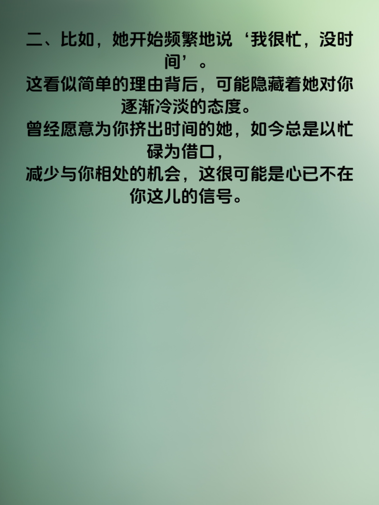 一、在男女情感的微妙世界里,女生的一些话语往往如同一把精准的尺子,能丈量出她内心与你距离的远近。当女生说出某些特定的话时,或许就意味着她的心已悄然远离。 二、比如,她开始频繁地说‘我很忙,没时间’。这看似简单的理由背后,可能隐藏着她对你逐渐冷淡的态度。曾经愿意为你挤出时间的她,如今总是以忙碌为借口,减少与你相处的机会,这很可能是心已不在你这儿的信号。 三、又或者,她常常说‘你别管我了’。这种拒绝你关心和参与她生活的话语,显示出她在有意与你保持距离。她不再期望你的陪伴和呵护,说明她的内心已经开始筑起一道墙,将你挡在外面。 四、还有,她若总是说‘我们不合适’。这直白的表达,往往是她经过深思熟虑后的结论。她的心已经在重新审视你们的关系,觉得彼此在各方面难以契合,从而产生了远离的想法。 五、男生们要敏锐捕捉这些话语背后的含义。当女生说出这些透露心已远离的话时,要及时反思自身,尝试沟通解决问题,若无法挽回,也要勇敢面对现实,毕竟感情不能强求,尊重她的选择也是一种爱的方式。