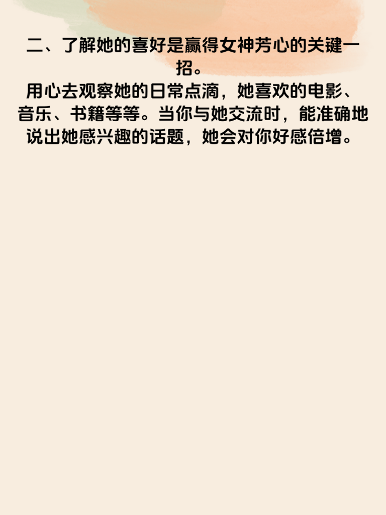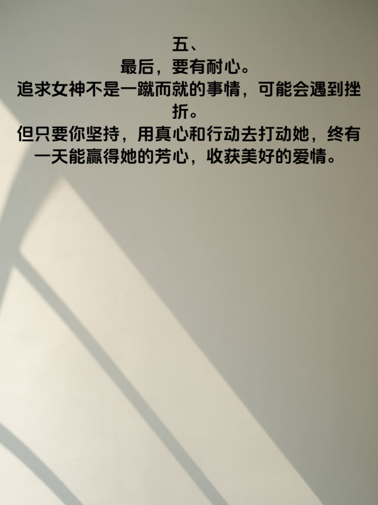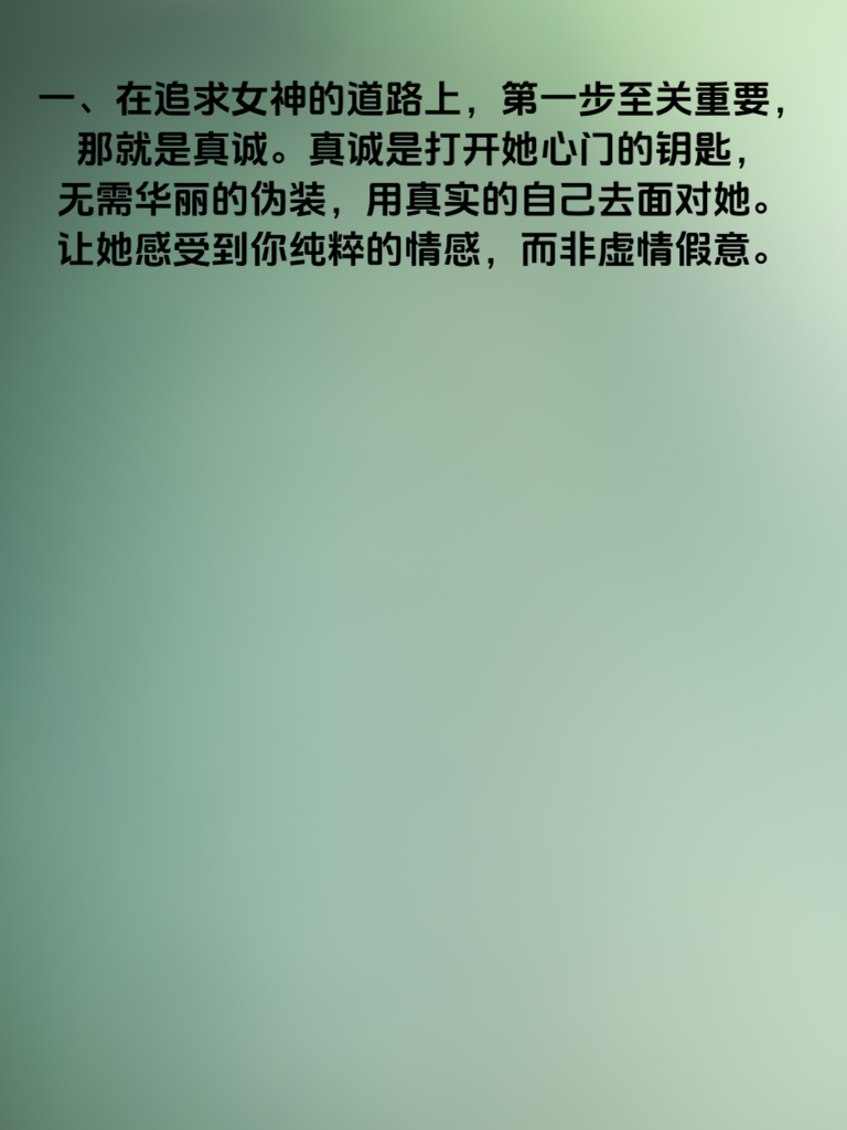 一、在追求女神的道路上,第一步至关重要,那就是真诚。真诚是打开她心门的钥匙,无需华丽的伪装,用真实的自己去面对她。让她感受到你纯粹的情感,而非虚情假意。 二、了解她的喜好是赢得女神芳心的关键一招。用心去观察她的日常点滴,她喜欢的电影、音乐、书籍等等。当你与她交流时,能准确地说出她感兴趣的话题,她会对你好感倍增。 三、注重细节能展现你的贴心。比如记住她不经意说过的小事情,在合适的时候送上一份小惊喜。下雨时递上一把伞,生日时准备一份精心的礼物,这些细节会让她感受到你的在乎。 四、保持自信也不可或缺。自信的你会散发独特的魅力,让她看到你的闪光点。敢于在她面前展示自己的才华和优点,但也要避免自负。 五、最后,要有耐心。追求女神不是一蹴而就的事情,可能会遇到挫折。但只要你坚持,用真心和行动去打动她,终有一天能赢得她的芳心,收获美好的爱情。