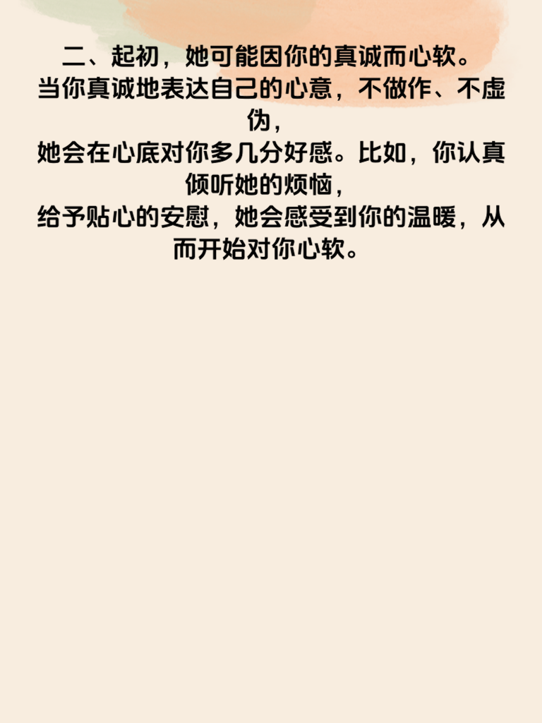 一、男人必看:这女生心软变化\n在追求女生的过程中,了解女生心软的变化至关重要。女生的心软并非一成不变,而是有着微妙的规律。 二、起初,她可能因你的真诚而心软。当你真诚地表达自己的心意,不做作、不虚伪,她会在心底对你多几分好感。比如,你认真倾听她的烦恼,给予贴心的安慰,她会感受到你的温暖,从而开始对你心软。 三、相处中,细节能让她持续心软。记住她的喜好、生日等重要日子,在不经意间送上小惊喜。她生病时,悉心照顾;下雨天,及时送伞。这些细节会慢慢堆积,让她的心越来越向着你。 四、但要注意,别过度试探她的心软底线。若总是利用她的心软来达到自己的目的,她会渐渐失望。真诚且适度地对待她的心软,才能收获美好的感情。
