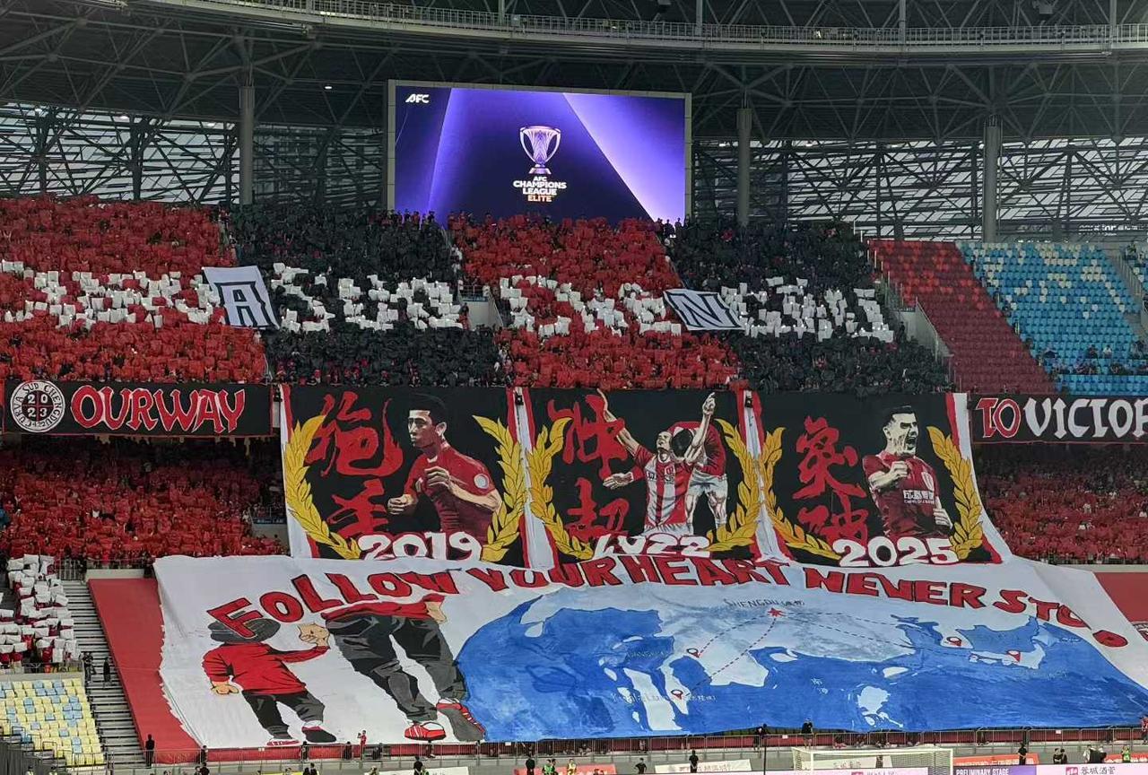 这一刻!震撼亚洲!亚冠,成都来了! 这个南看台的TIFO,采用了三星堆的青铜人面像为主要元素,并且借鉴了欧洲多个豪门球队的做法,十分震撼地展现了成都首次征战亚冠赛事的壮观场景 同时,东西两侧的看台均是红白色相间,中间有队徽的图案,而北看台则是三个历史时刻,一个是中乙的绝杀,一个是冲超附加赛的制胜瞬间,另一个则是锁定亚冠资格!