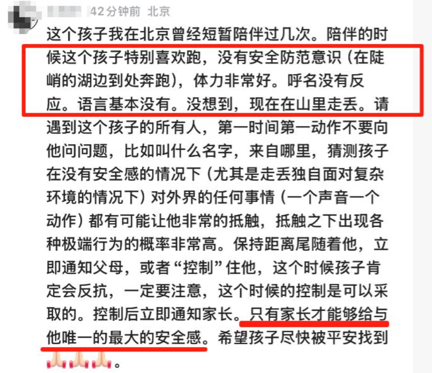 更让人担心的是,这名孩子和普通孩子不同,没有自救意识,即便有人靠近,他也可能毫无反应。加之山中天气多变,夜间气温接近零下,这让救援工作更为艰难。一般来说,在山中错过 72 小时黄金救援期,生还几率将大幅下降,更何况是一名年仅 7 岁的孩子。