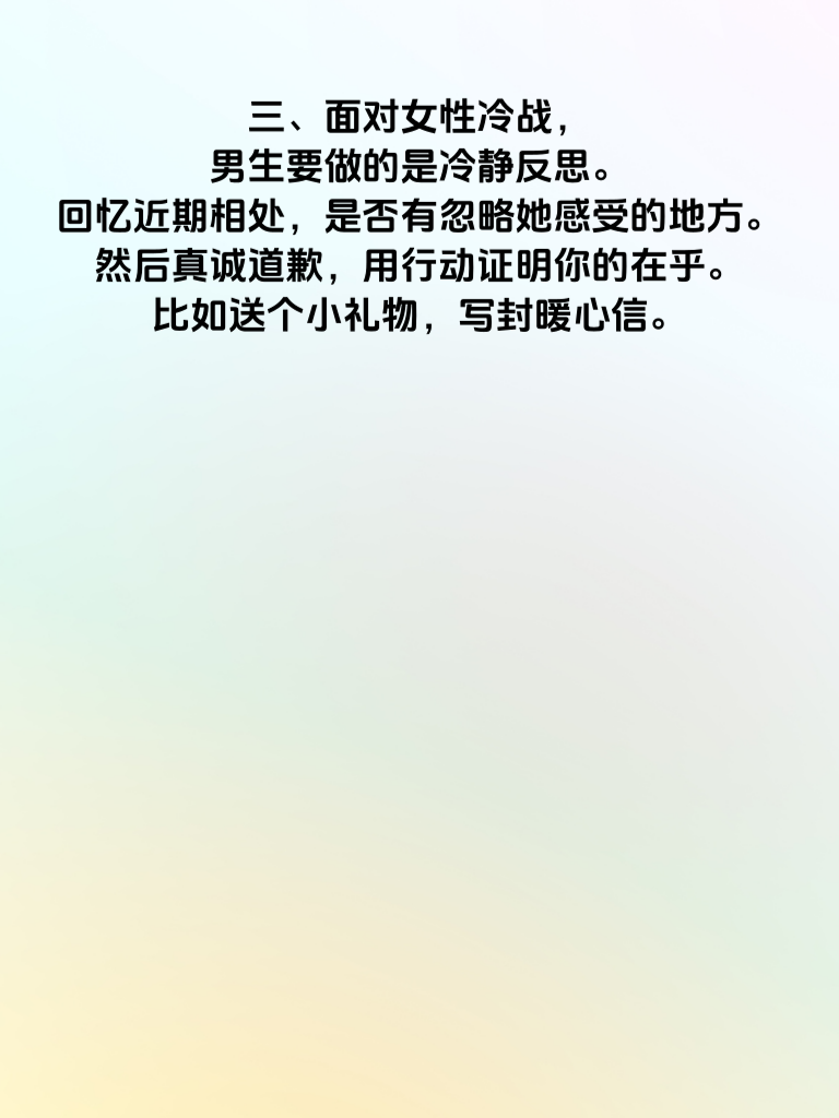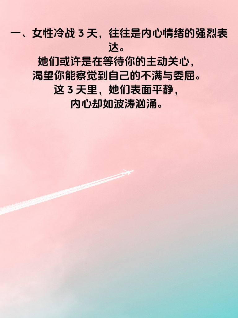一、女性冷战 3 天,往往是内心情绪的强烈表达。她们或许是在等待你的主动关心,渴望你能察觉到自己的不满与委屈。这 3 天里,她们表面平静,内心却如波涛汹涌。 二、关系急转直下的关键在于,男生若未能及时打破冷战僵局。女生会觉得自己被忽视,感情在这 3 天里逐渐降温。原本亲密的关系,开始有了隔阂。 三、面对女性冷战,男生要做的是冷静反思。回忆近期相处,是否有忽略她感受的地方。然后真诚道歉,用行动证明你的在乎。比如送个小礼物,写封暖心信。 四、主动沟通很重要。不要害怕尴尬,真诚地询问她冷战的原因。倾听她的想法,让她感受到你对这段关系的重视,避免关系因冷战而彻底破裂。