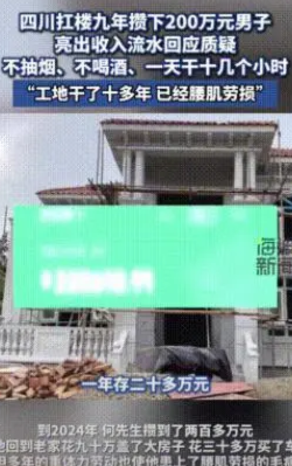 说起来,这哥们的奋斗史简直就是一部血泪史。九年来,人家每天从清晨五点干到半夜,别人搬一千块砖,他能搬两千;别人休息,他还在那儿挥汗如雨。工地成了他的第二个家,砖块成了他的老朋友。就凭这股子拼劲儿,他从一天赚七八百块一路飙升到上千块,九年下来,存款嗖嗖地往上涨,直接破了200万大关,还成了不少人眼里的“逆袭大神”。