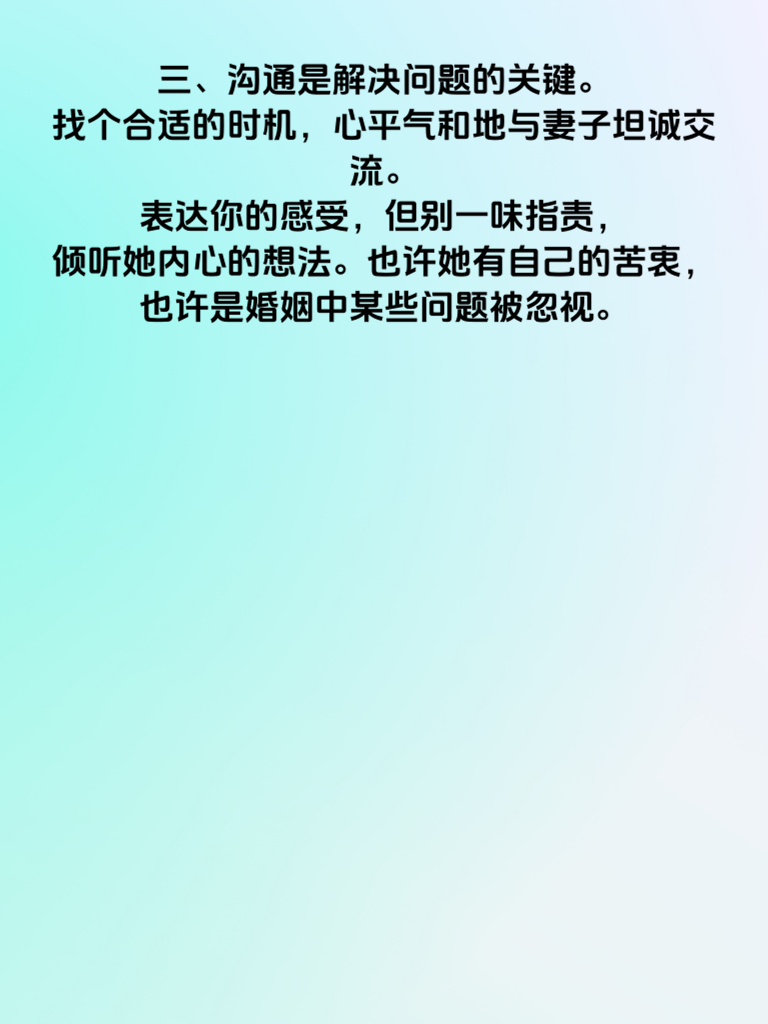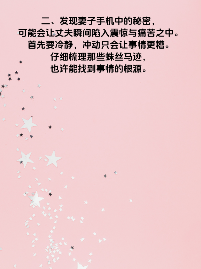 一、婚姻,本应是两个人携手走过风雨的承诺。然而,当“婚内出轨”这个沉重的话题出现,一切都变得复杂起来。妻子手机中的秘密,往往藏着许多不为人知的情感纠葛。 二、发现妻子手机中的秘密,可能会让丈夫瞬间陷入震惊与痛苦之中。首先要冷静,冲动只会让事情更糟。仔细梳理那些蛛丝马迹,也许能找到事情的根源。 三、沟通是解决问题的关键。找个合适的时机,心平气和地与妻子坦诚交流。表达你的感受,但别一味指责,倾听她内心的想法。也许她有自己的苦衷,也许是婚姻中某些问题被忽视。 四、无论结果如何,都要学会保护自己。如果婚姻已无法挽回,也要理智面对,为自己的未来做好规划。记住,伤痛会过去,新的生活在前方。不要让婚内出轨的阴影永远笼罩自己,勇敢迈向新的人生阶段。