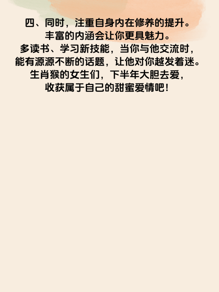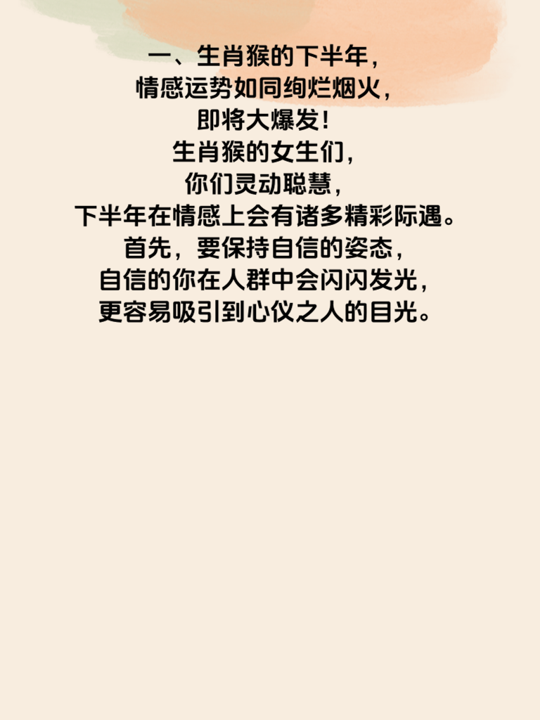 一、生肖猴的下半年,情感运势如同绚烂烟火,即将大爆发!生肖猴的女生们,你们灵动聪慧,下半年在情感上会有诸多精彩际遇。首先,要保持自信的姿态,自信的你在人群中会闪闪发光,更容易吸引到心仪之人的目光。 二、社交场合是拓展缘分的绝佳时机。积极参与各类活动,发挥你们活泼开朗的天性,主动与人交流互动。说不定在某个不经意的瞬间,就能邂逅那个与你灵魂契合的他。 三、对于已经有好感的男生,别再羞涩。适时地展现你的热情与真诚,巧妙地制造一些相处机会。比如以请教问题为由,拉近彼此距离。记住,真诚是打开对方心门的钥匙。 四、同时,注重自身内在修养的提升。丰富的内涵会让你更具魅力。多读书、学习新技能,当你与他交流时,能有源源不断的话题,让他对你越发着迷。生肖猴的女生们,下半年大胆去爱,收获属于自己的甜蜜爱情吧!