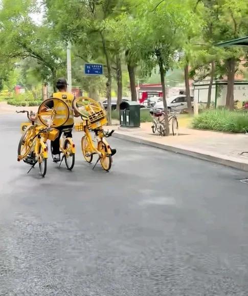 叠罗汉式骑行!共享单车管理员一人骑五辆单车,网友:停车怎么办? 近日,一段共享单车管理员“叠罗汉式”骑行的视频在网络引发热议。 画面中,一名管理员同时驾驭五辆共享单车,车辆前后相连,摇摇晃晃却仍保持平衡,场面既惊险又吸睛。 网友纷纷调侃,骑车技术这么高超,但停车时岂不是要“翻车”? 更有网友表示,这简直是现实版杂技表演! 对此,业内人士解释称,共享单车管理员在日常工作中需频繁调度车辆,尤其在早晚高峰或地铁站等人流密集区域,快速转移闲置车辆是提高运营效率的关键。 虽然“一人骑五车”的场面少见,但或许是管理员在紧急情况下采取的临时措施。 至于停车问题,管理员们自有妙招。 他们常年与单车打交道,对车辆平衡和重量分布了如指掌,通常采用逐辆停放或借助坡道辅助的方式,确保安全。 有管理员笑称,熟能生巧,练多了就像骑一辆一样稳。 这段视频再次让公众看到,共享单车背后工作人员的辛劳。 城市出行便利的背后,离不开这些“单车忍者”的默默付出。
