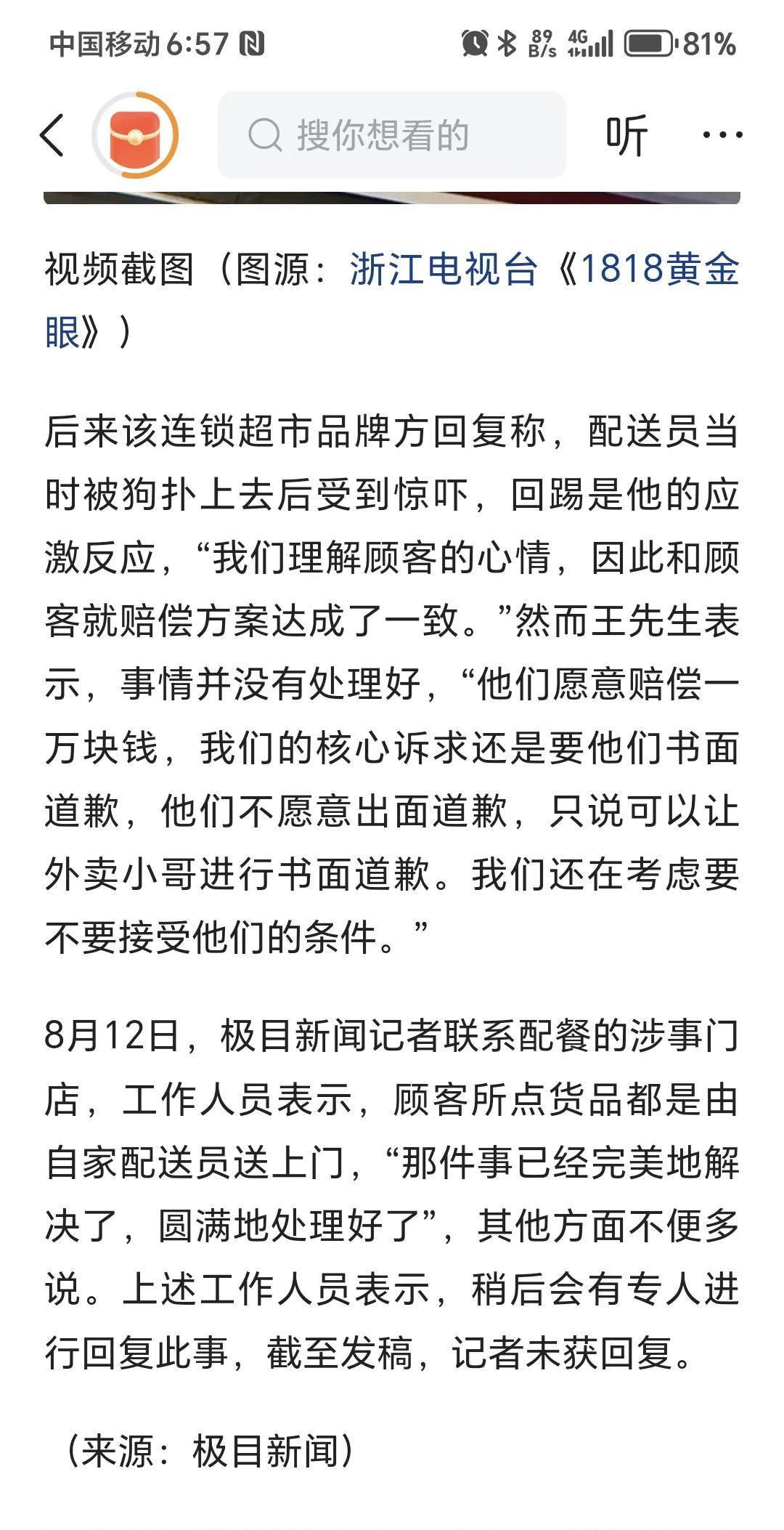 杭州一外卖员送餐被狗扑,踢死顾客的狗。 顾客狮子大张口要索赔一万元,还要公开道歉,店家只愿意口头道歉。最后的消息是协商一致,估计店家息事宁人了。 不管好自己的狗,扑咬他人,还讹成功了,从来不想着自己没有管好狗的责任。希望有关部门能严惩违规养狗不拴狗绳的行为。 #狗伤人事件# #送外卖事故# #外卖骑手拒赔# #外卖员冲突# #被宠物狗咬伤# #狗咬伤人# #被狗咬伤案# #外卖员# #为什么城市不禁止养狗# #流浪猫、流浪狗怎么处理为最佳# #面对遛狗不拴绳的,举报有没有奖励# #遇到遛狗不牵绳子的你会怎么办#