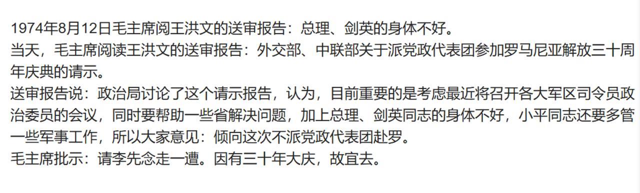1974年8月12日毛主席阅王某文的送审报告。 老人家亲自批示:请李先念走一遭。