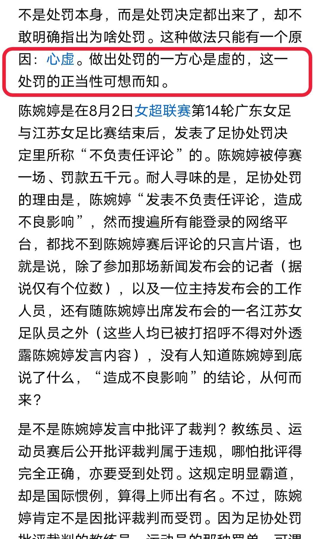 陈婉婷受罚,硬刚的权威媒体居然是济南日报,这份义薄云天的仗义,能够挽回少帅离开中国足球的心吗? 资深球迷都明白,1983年就成立的山东女足跌跌撞撞走到今天,她们哪怕高手如云、哪怕财大气粗、哪怕青训加持却总是难以登峰造极,缺的是一个足球理念先进、国际视野开阔、打造青春军团有力的领头狼。 中国足协是8月6号公告的对陈婉婷的处罚决定书,济南日报是时隔5天后的8月11号发文,如果你认为这是人家吃饱了撑的写着玩的,那就肤浅了。 截屏了济南日报的三张图片,看看他们的文章深度吧,得罪宋凯他们是肯定的了,但感动陈婉婷的概率有可能更大。