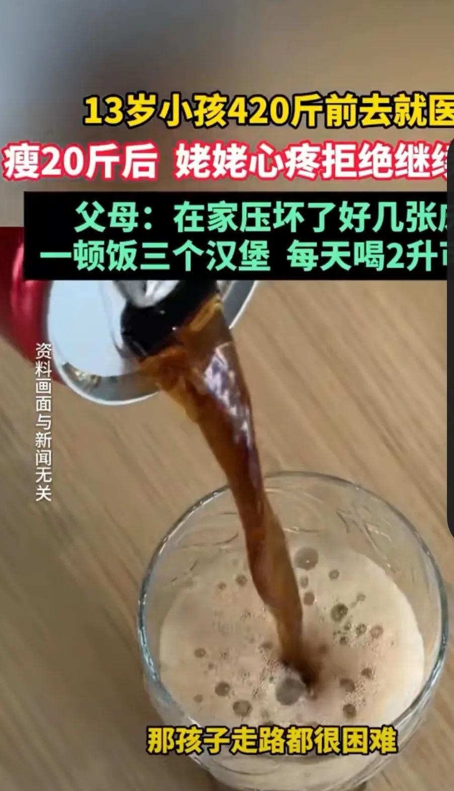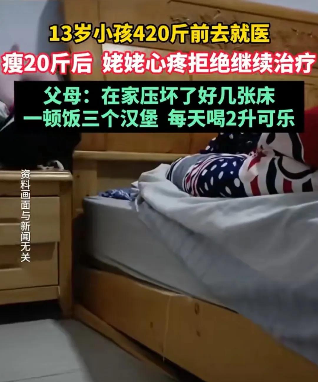 13岁男孩体重420斤的新闻让不少人震惊。这个孩子一顿饭能吃三个汉堡,每天还要喝2升可乐,体重已经严重影响到生活,甚至在家压坏了好几张床。 父母带他去就医,经过努力瘦了20斤,可姥姥却因为心疼拒绝让他继续治疗。这背后反映出的问题值得我们深思,过度溺爱反而可能害了孩子。 医生表示,孩子的肥胖已经导致走路都很困难,继续这样下去会引发多种健康问题。科学减重对他来说至关重要,需要家人的配合和支持。 你觉得在孩子的成长过程中,家人应该如何把握关爱和管教的尺度呢?来评论区说说你的看法。